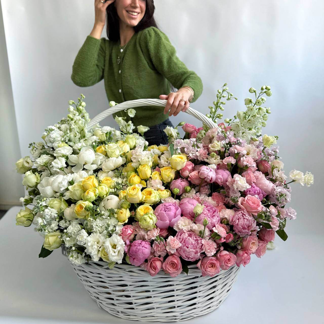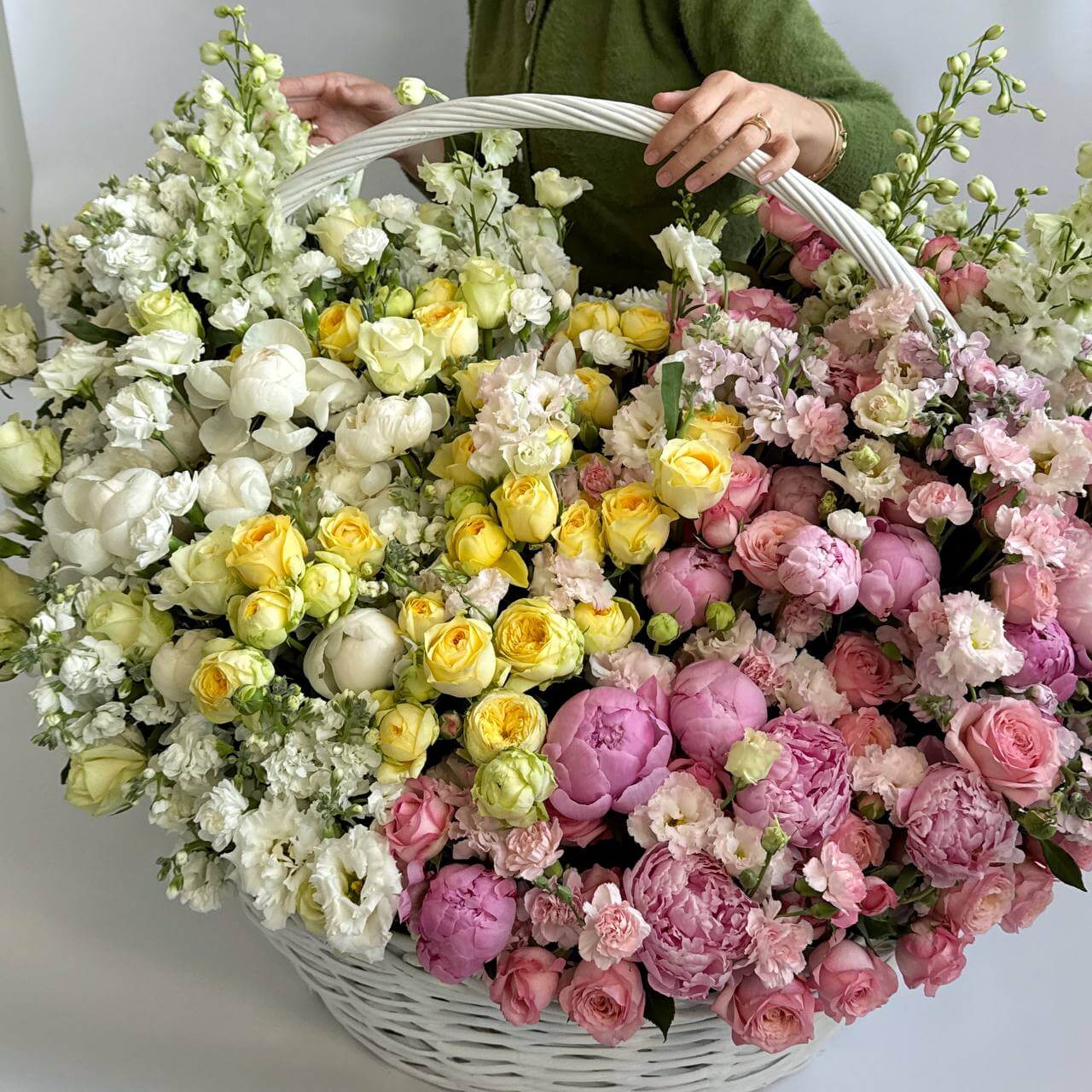 Сладкий аромат этой корзины заполнит весь дом, а нежность покорит получателя. В составе композиции пионовидные розы вайт охара, ароматные фрезии, ранункулюсы, кружевная эустома, пионовидные кустовые розы мисти баблз, гортензии и скимия.