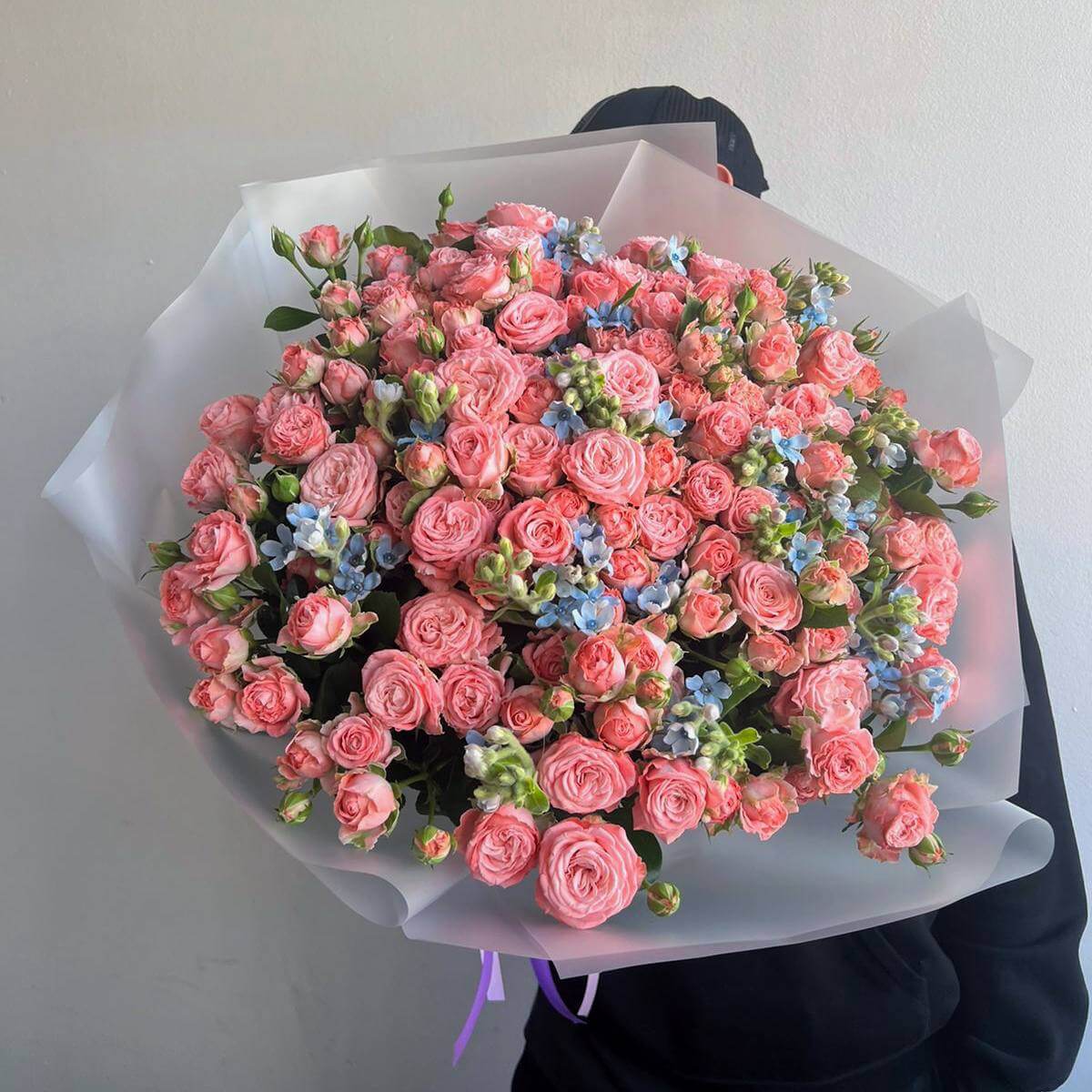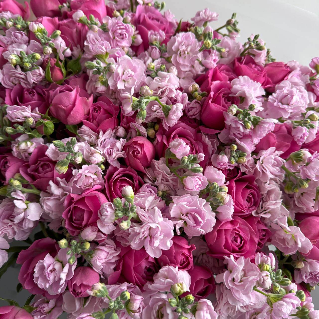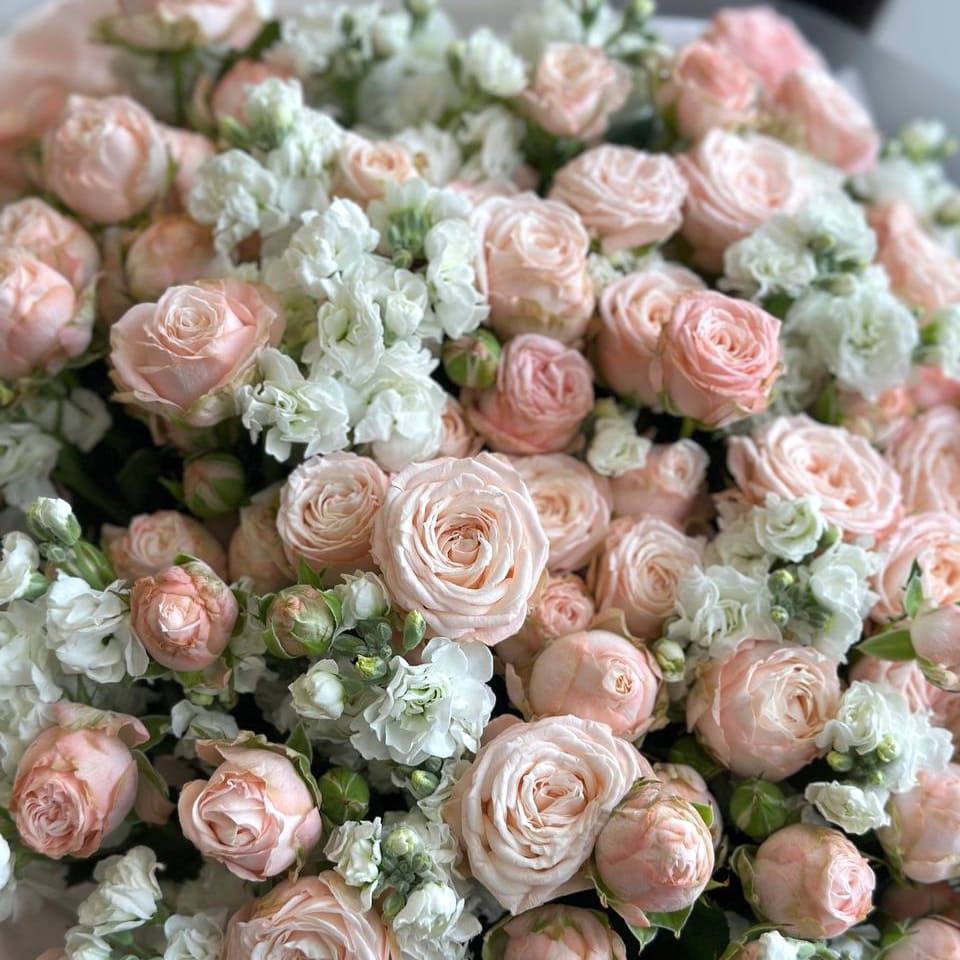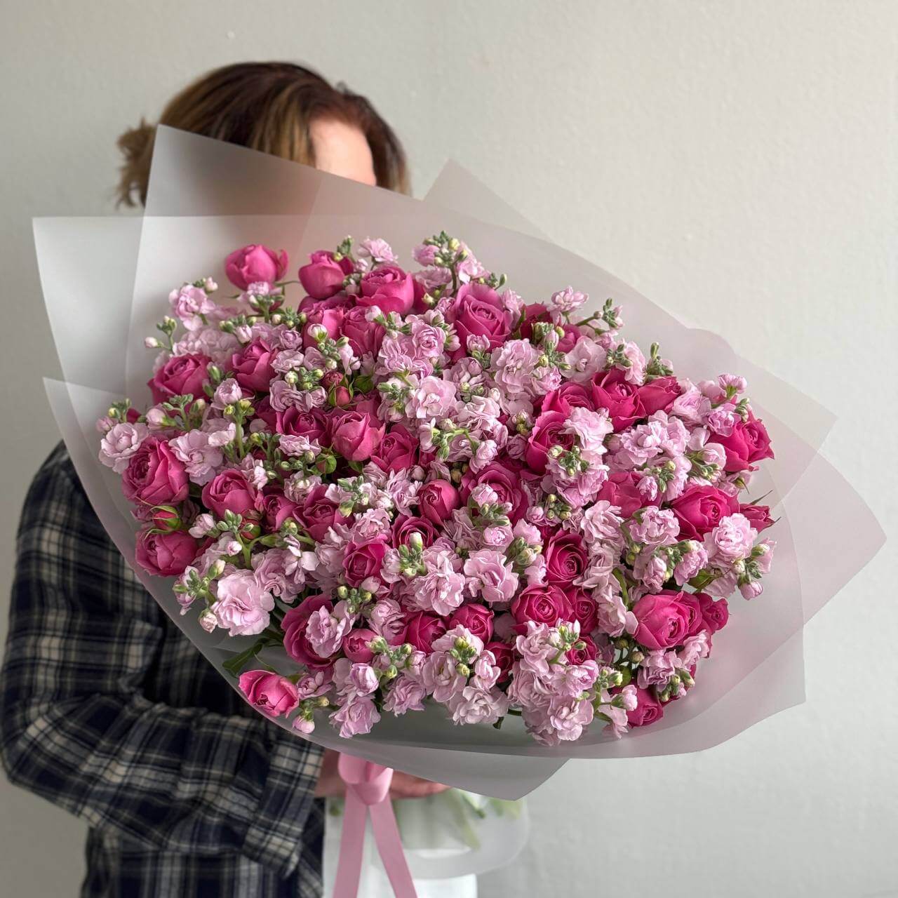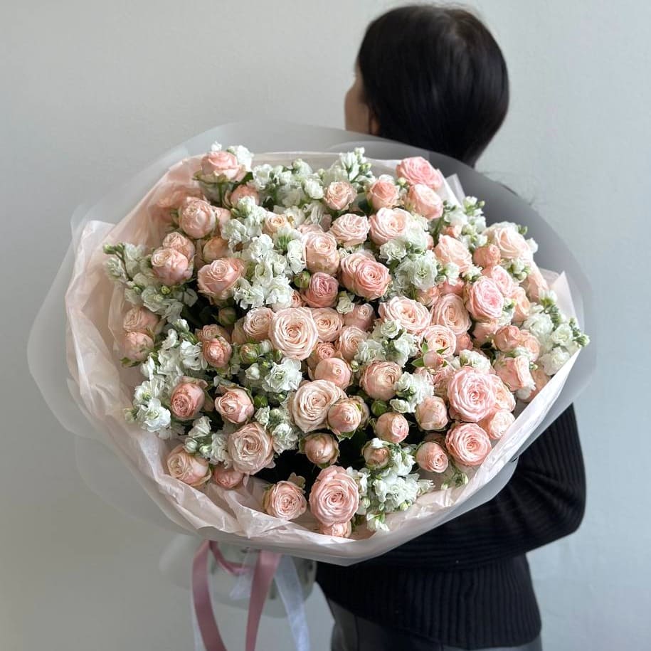 Дуо-букет из пионовидных кустовых роз мисти баблз(имеют сладкий аромат) и душистой кустовой маттиолы. Упаковка стильная матовая пленка и ленты атласные.