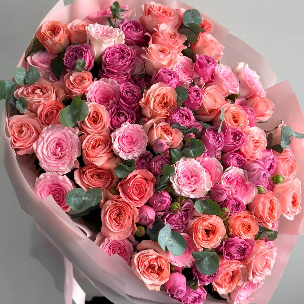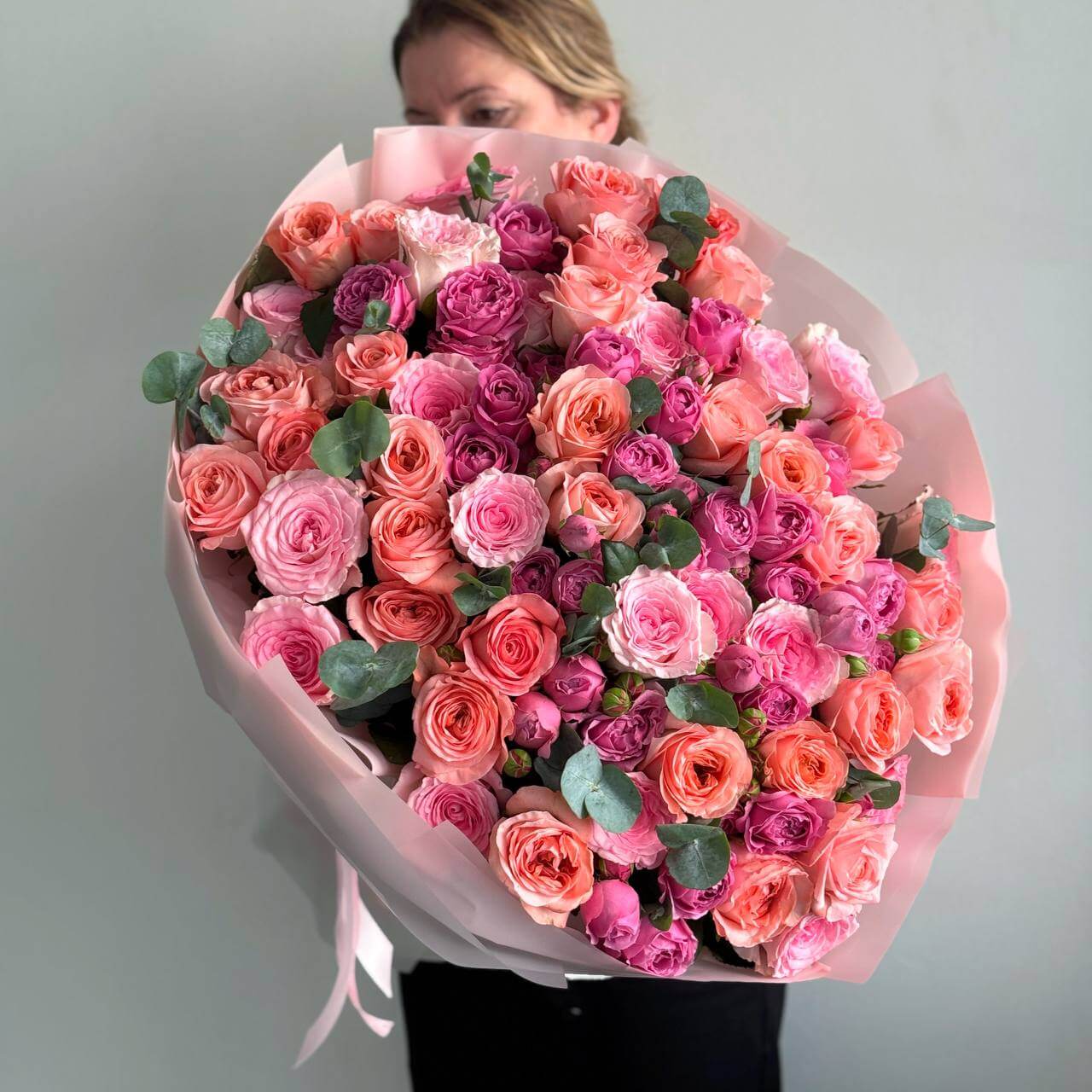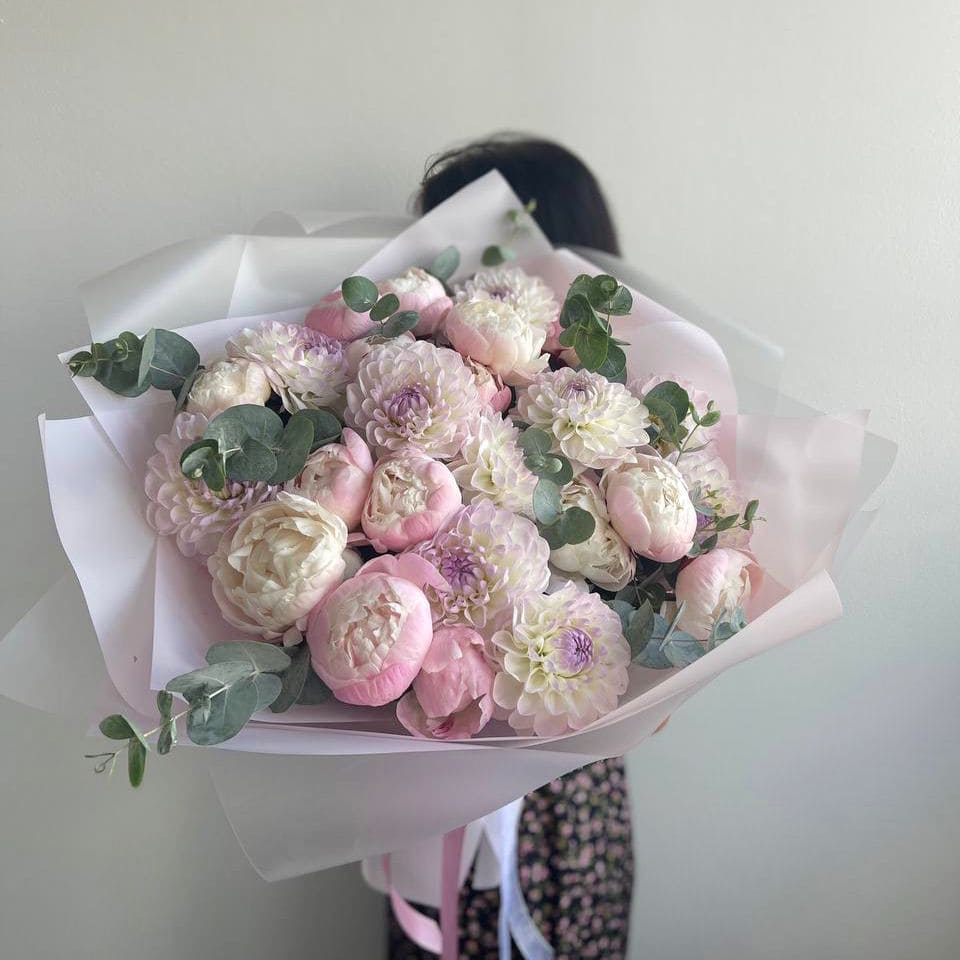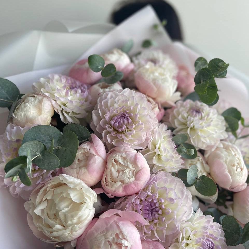 Нежный микс из кустовых пионовидных роз мисти балз, пионовидных роз, эвкалипта и нежный классических роз. Упаковка дизайнерская пленка и ленты атласные.
