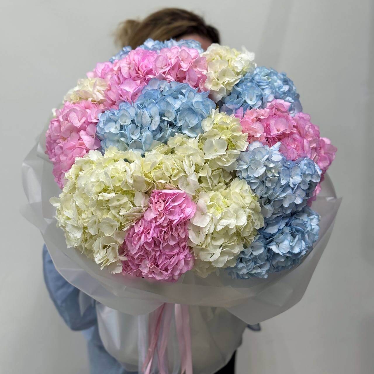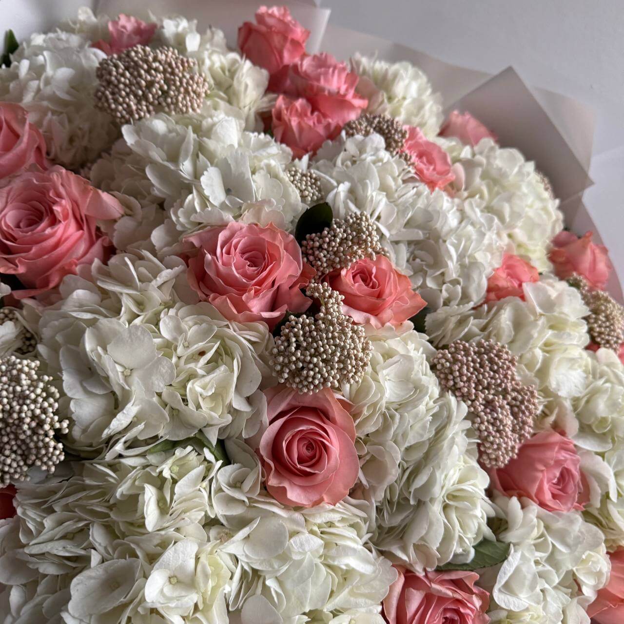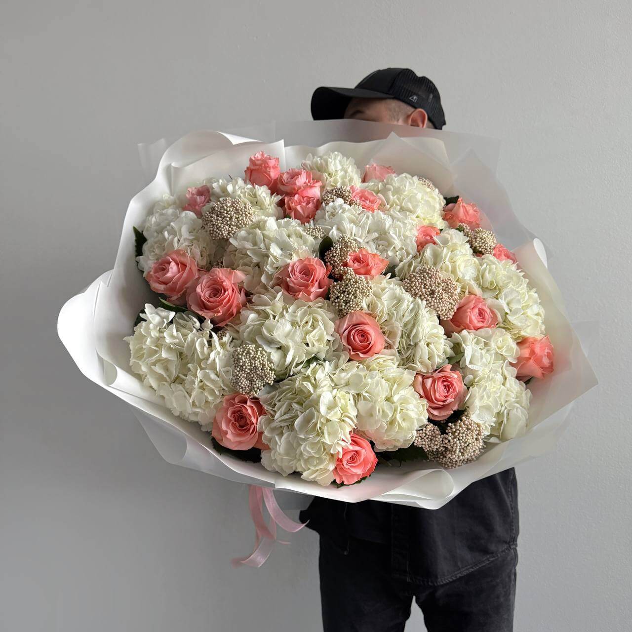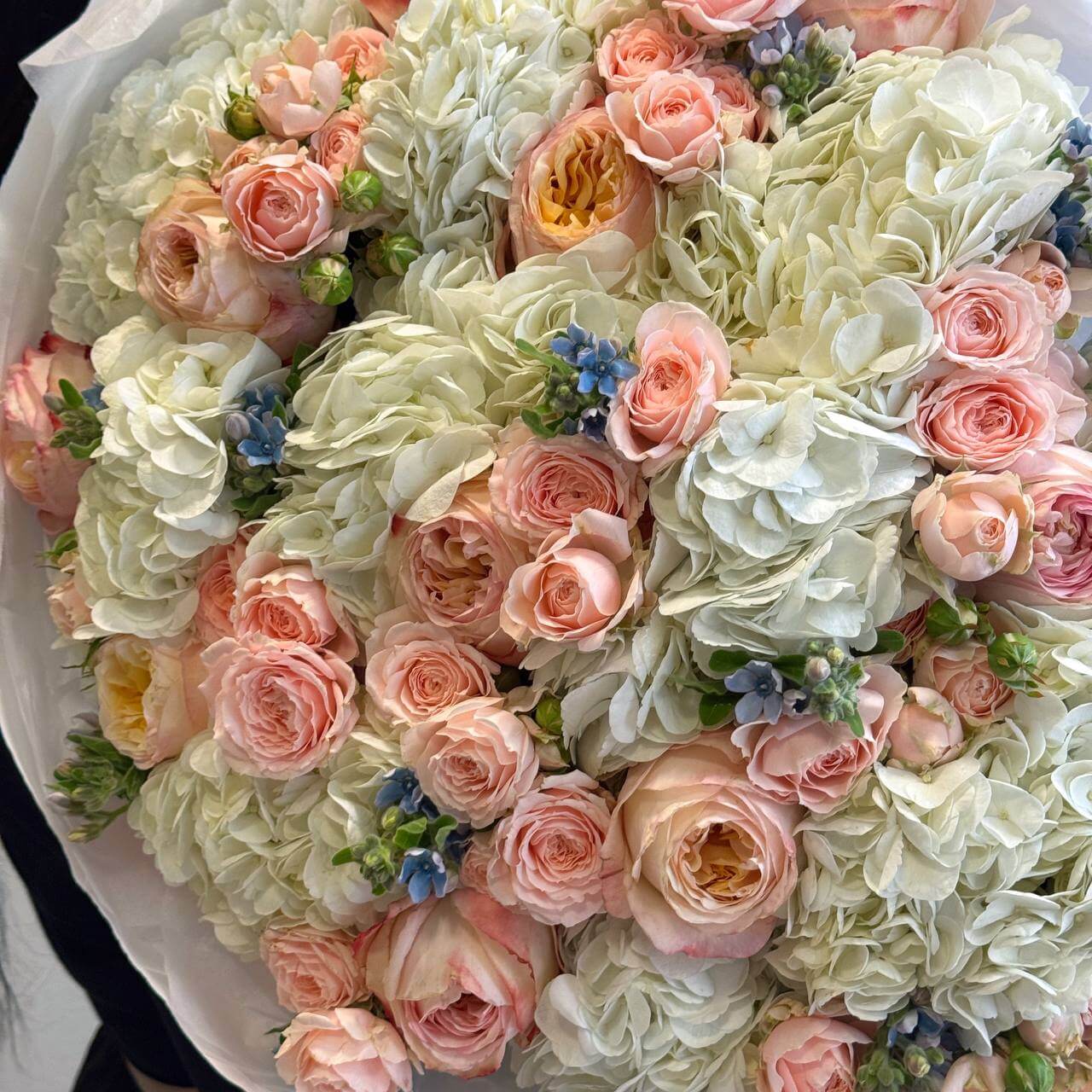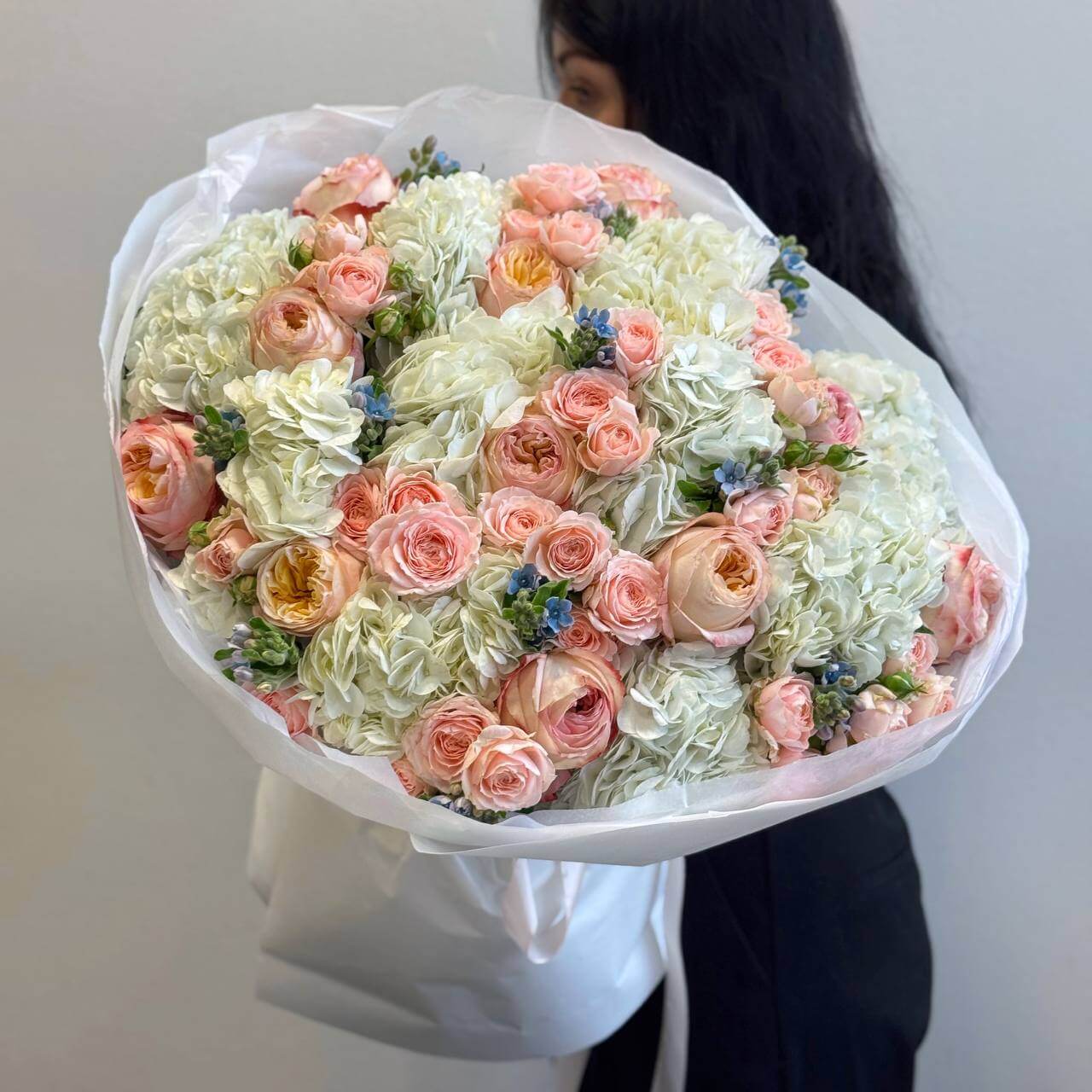 Нежный дуо-букет из пионовидных ароматных роз мисти баблз и гортензий. Упаковка дизайнерская пленка и ленты атласные. Вы можете выбрать нужный размер букета: S - диаметр от 40см(на фото) M - 50см L - 70см XL - 80см