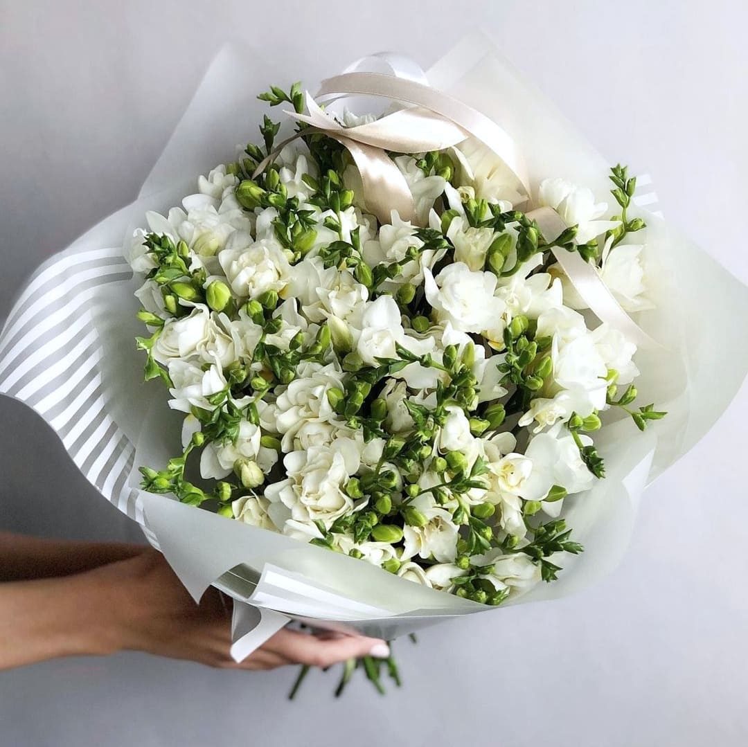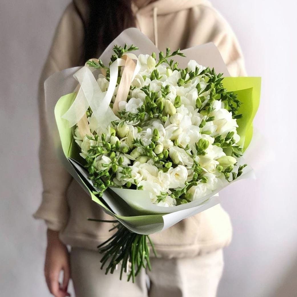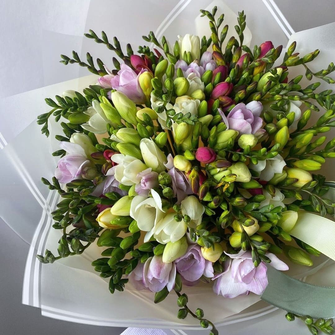 Фрезии - невероятно ароматные, элегантные и стойкие цветы. Упаковка стильная пленка и ленты атласные.