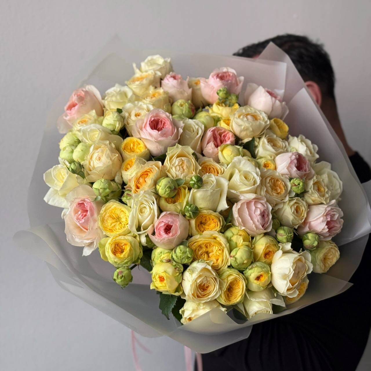 Солнечный микс из 3х видов пионовидных роз. Станет незабываемым и ярким подарком. Упаковка дизайнерская матовая пленка и ленты атласные.
