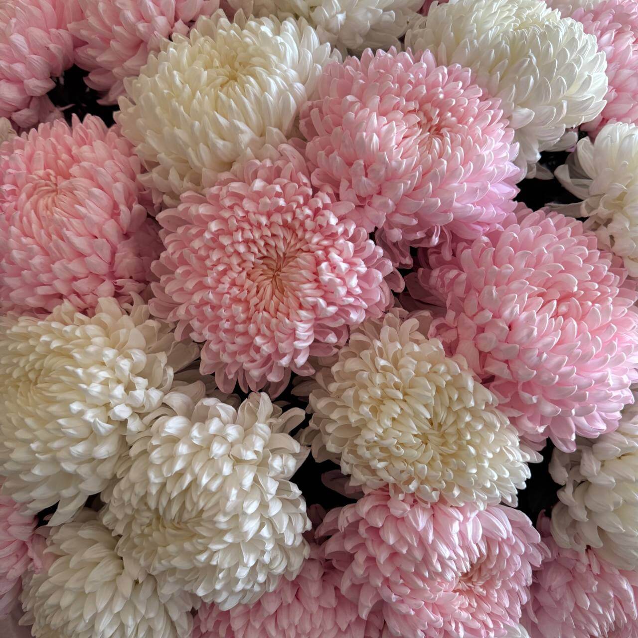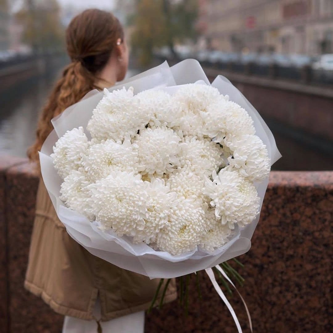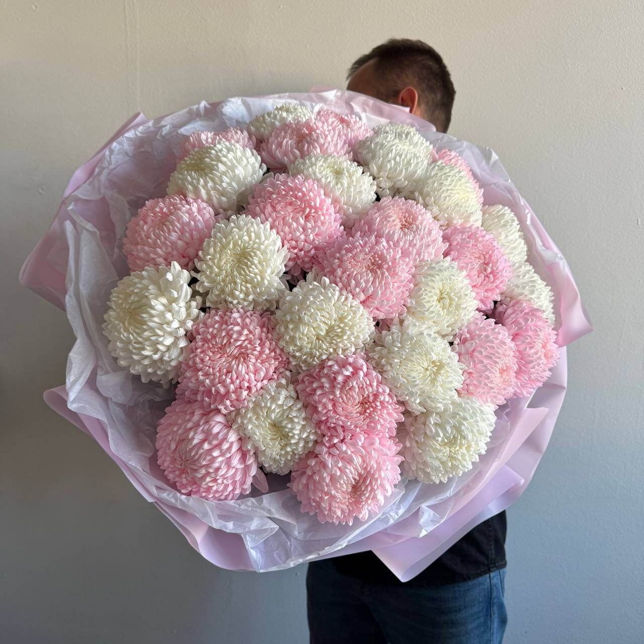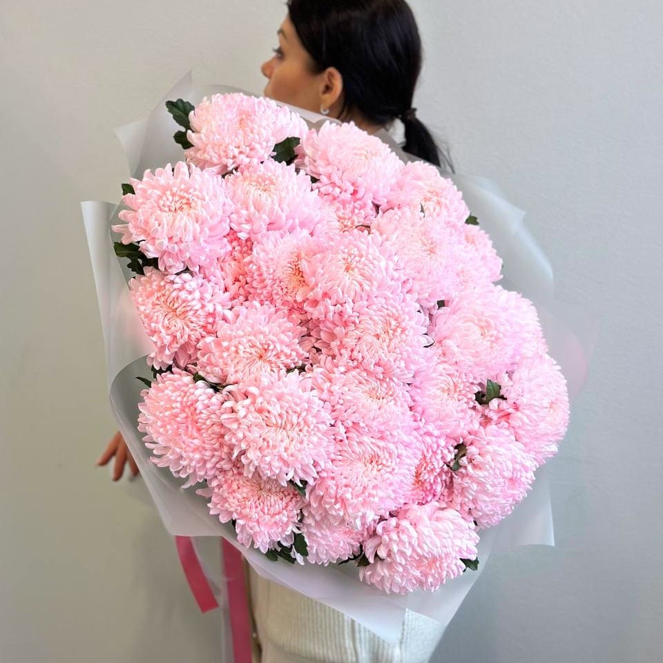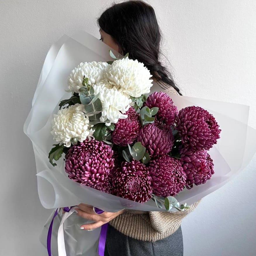 Сезонные крупные хризантемы. Стойкие и обьемные. Упаковка дизайнерская пленка и ленты атласные.