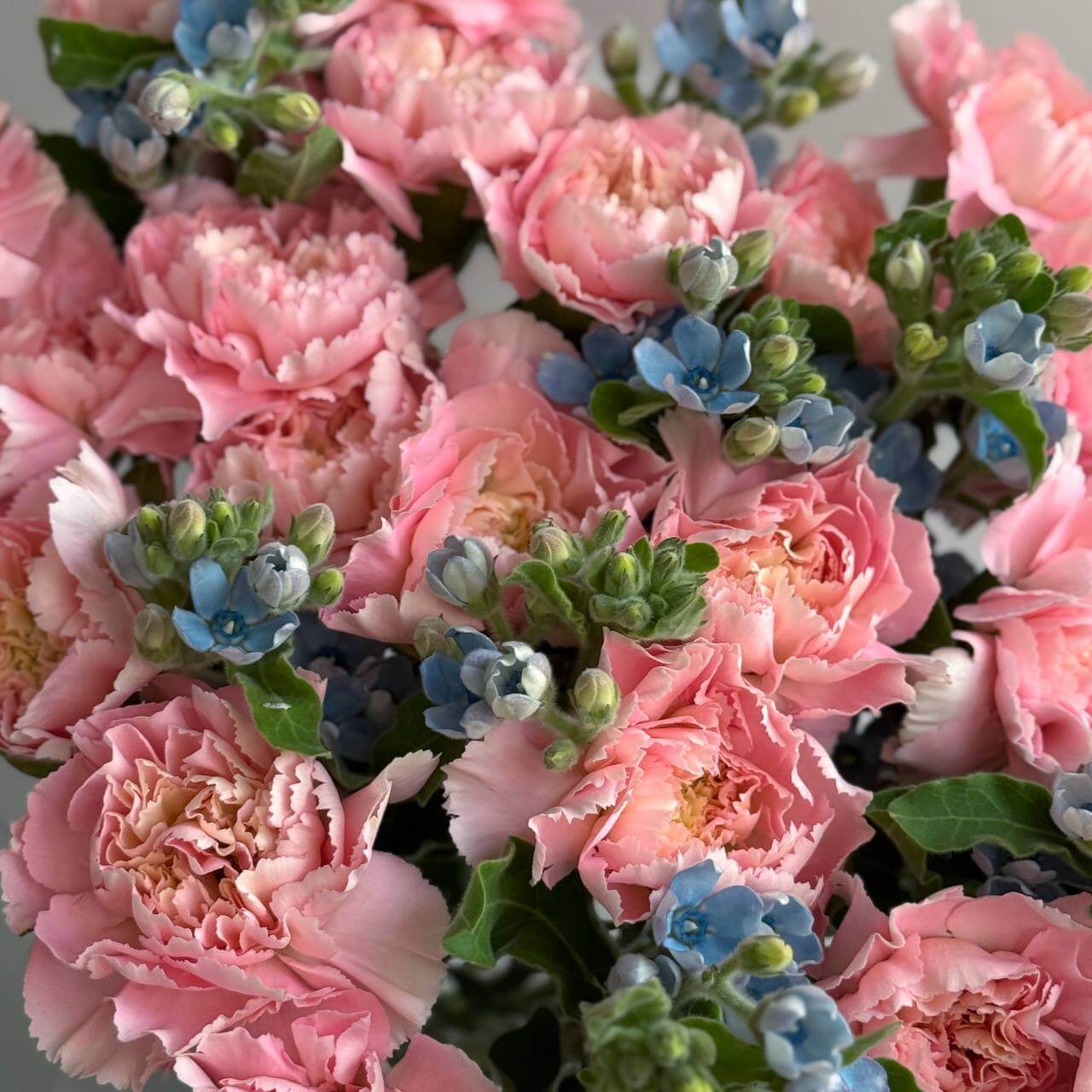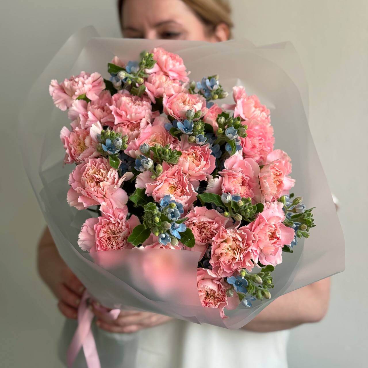 Дуо-букет из розовых гвоздик и оксипеталума. Упаковка матовая пленка и ленты атласные.
