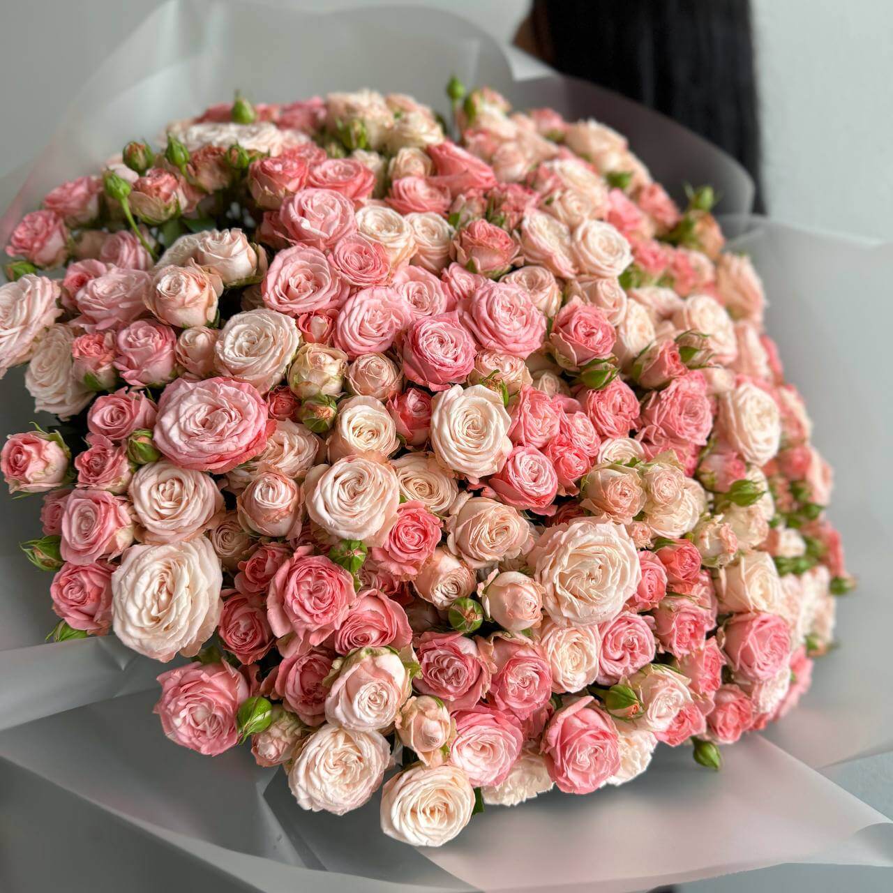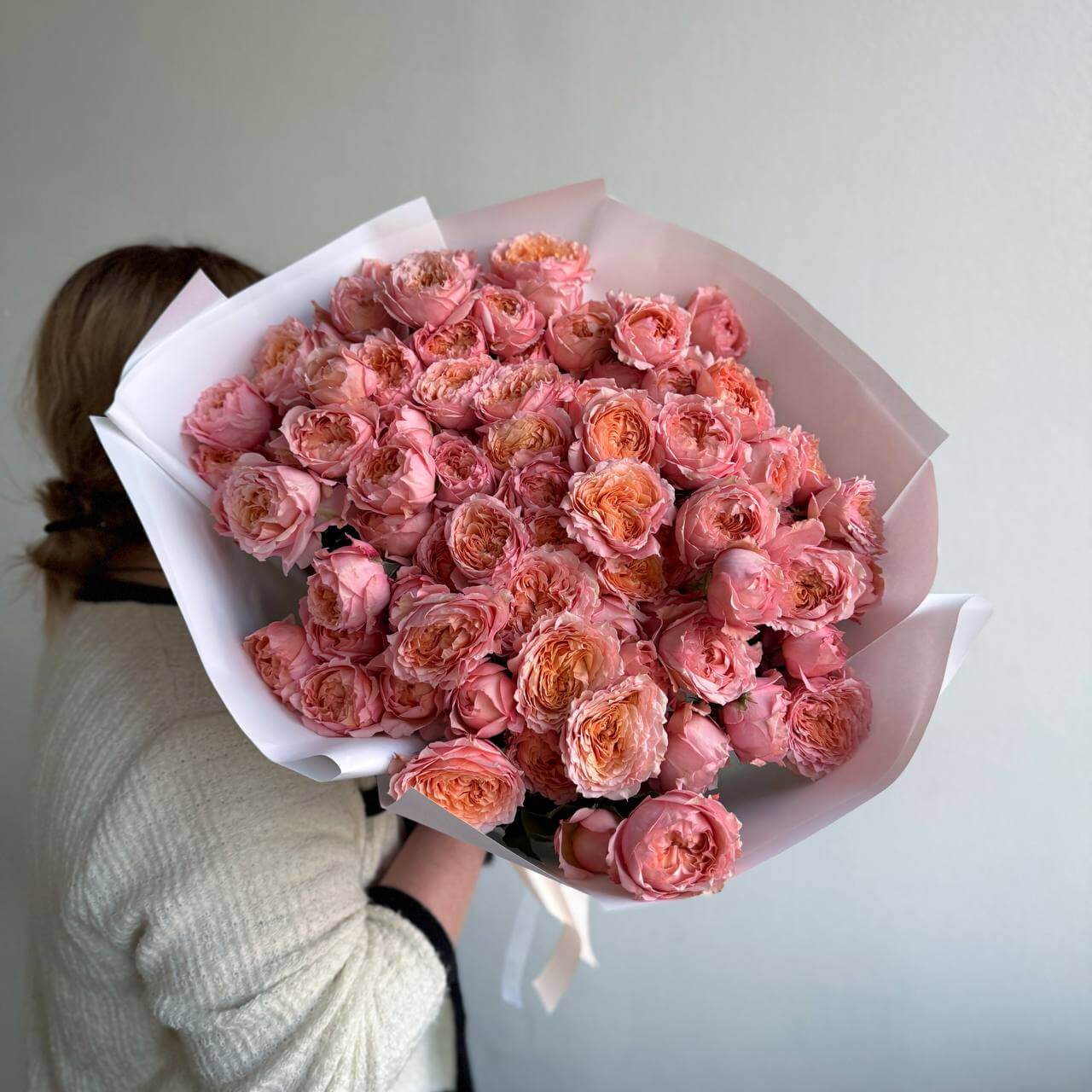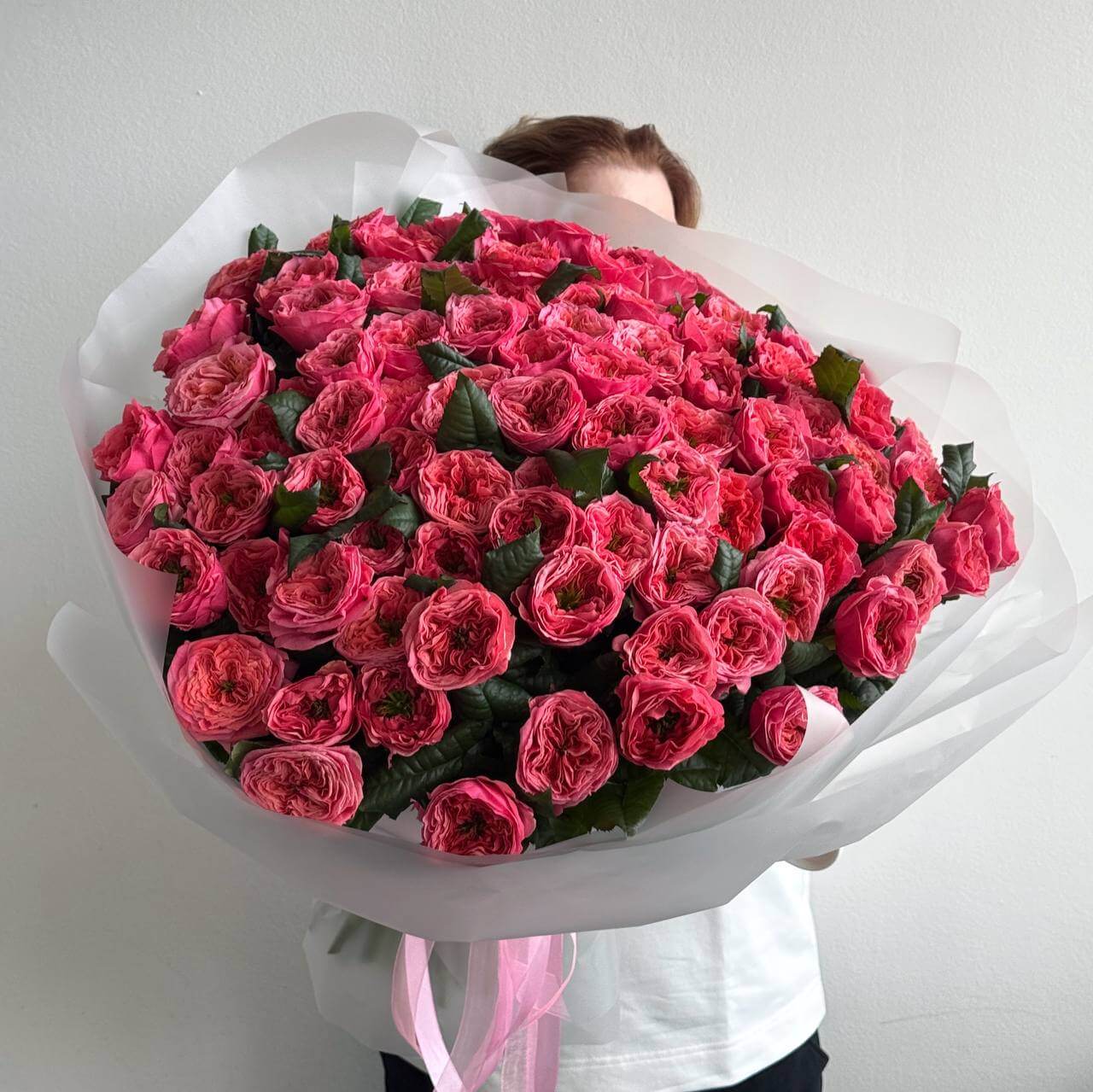 Микс из кустовых пионовидных роз бомбастик и мадам бомбастик. Упаковка стильная матовая пленка и ленты атласные.