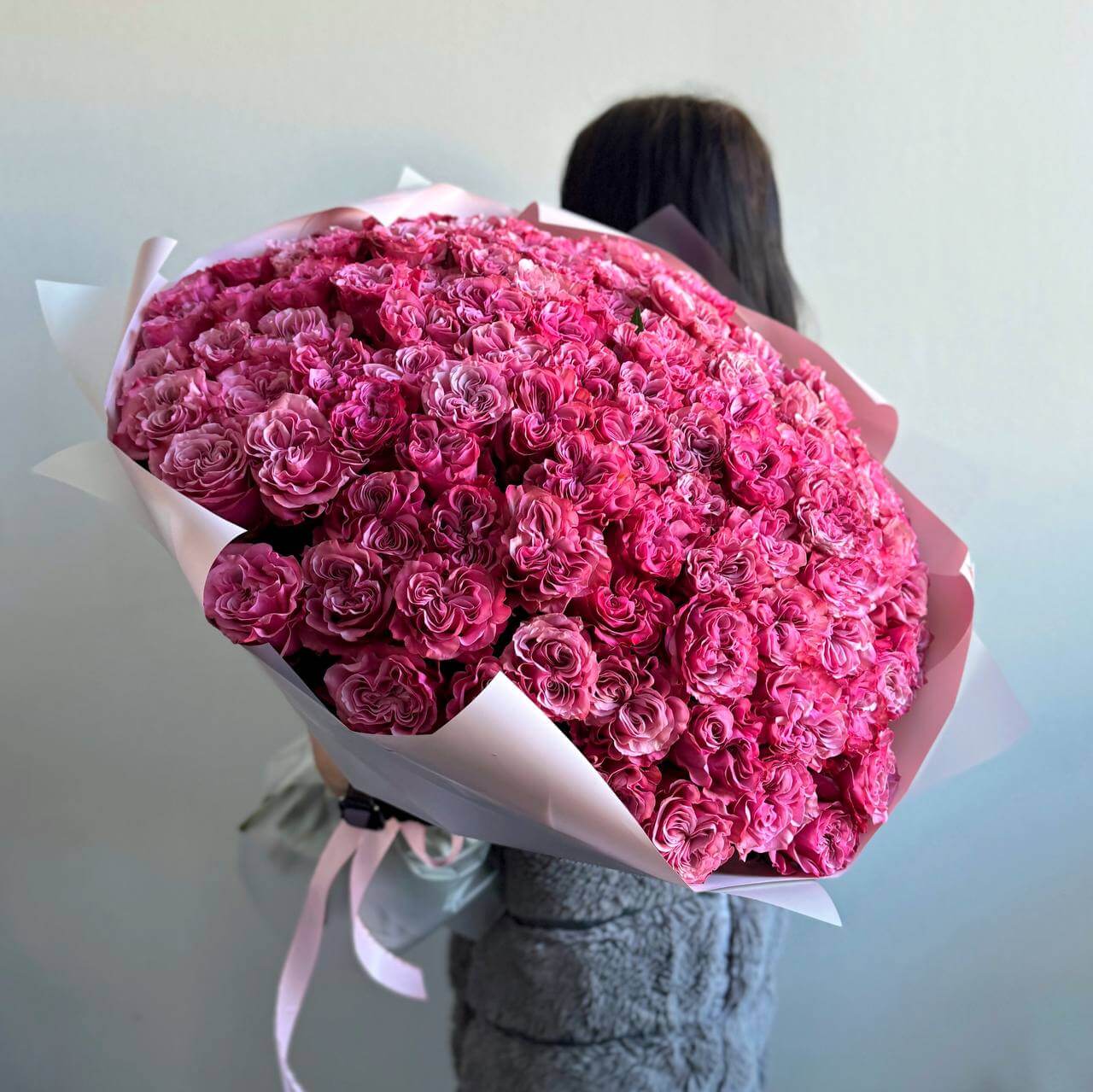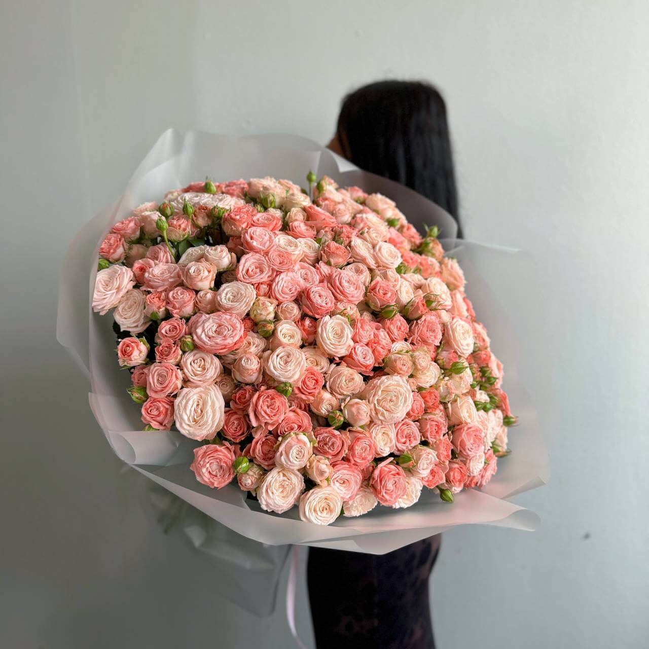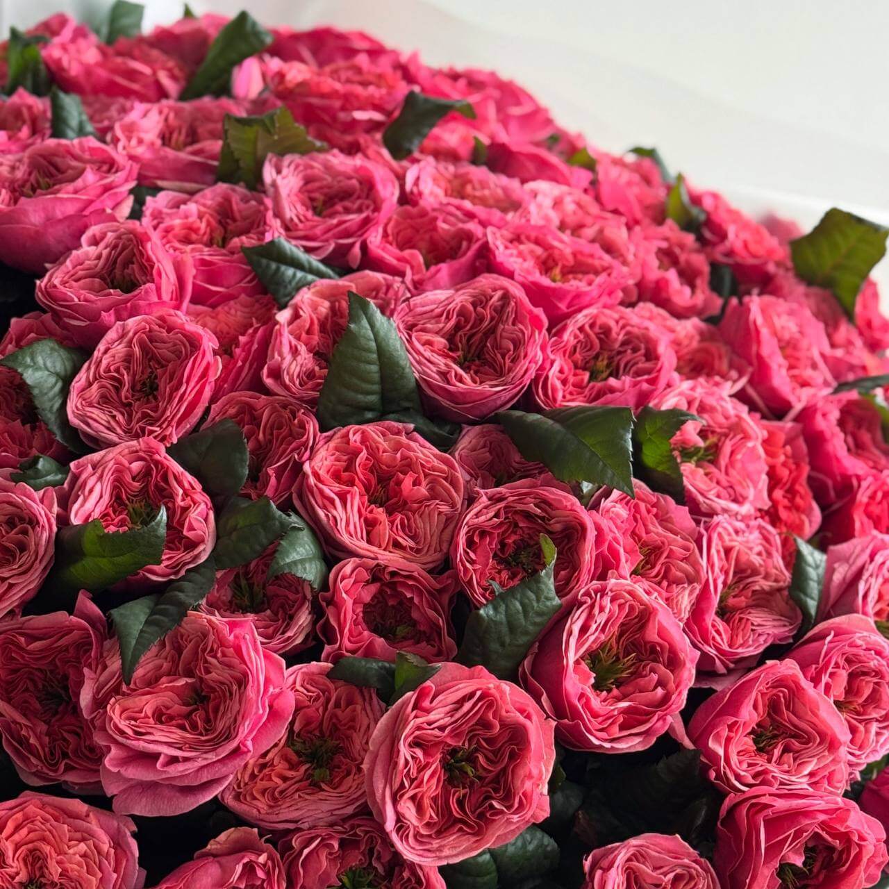 Микс из кустовых пионовидных роз бомбастик и мадам бомбастик. Упаковка стильная матовая пленка и ленты атласные.