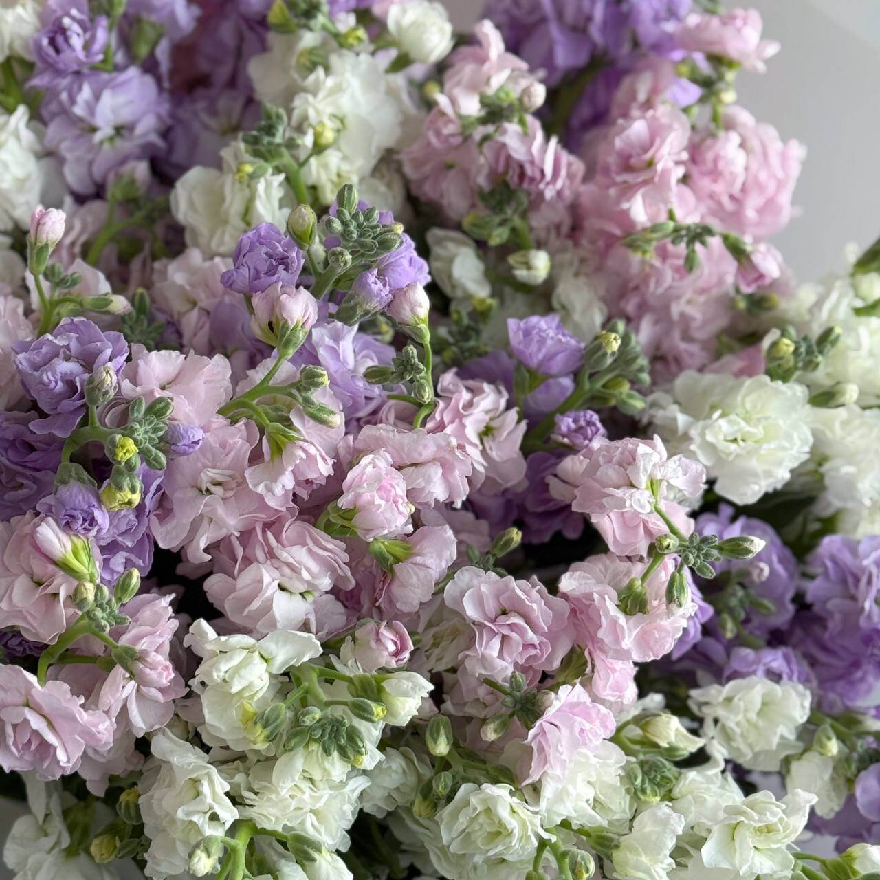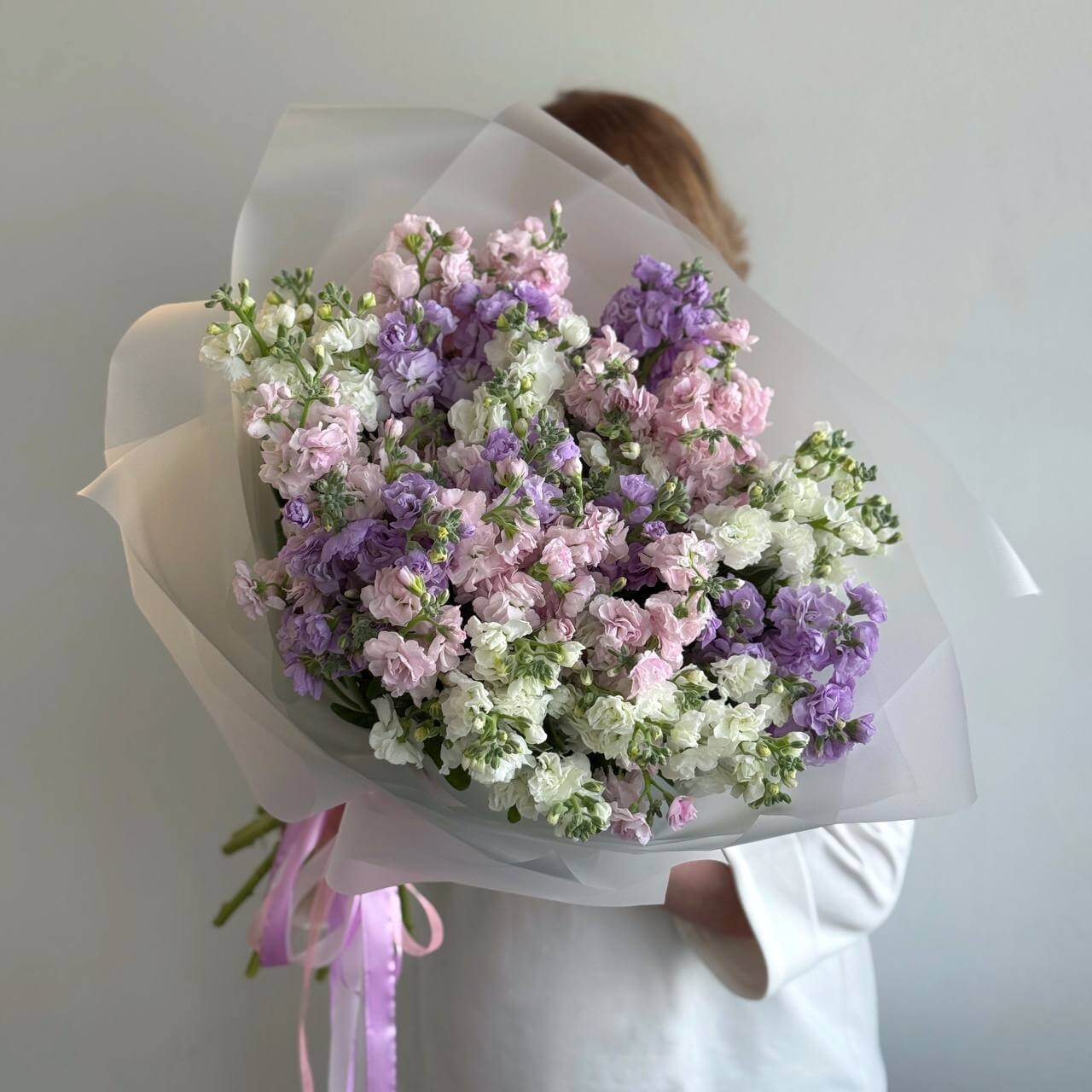 Пышная и ароматная кустовая маттиола – наша любимица. В наличии розового, белого и фиолетового цвета. Упаковка стильная пленка и ленты атласные.