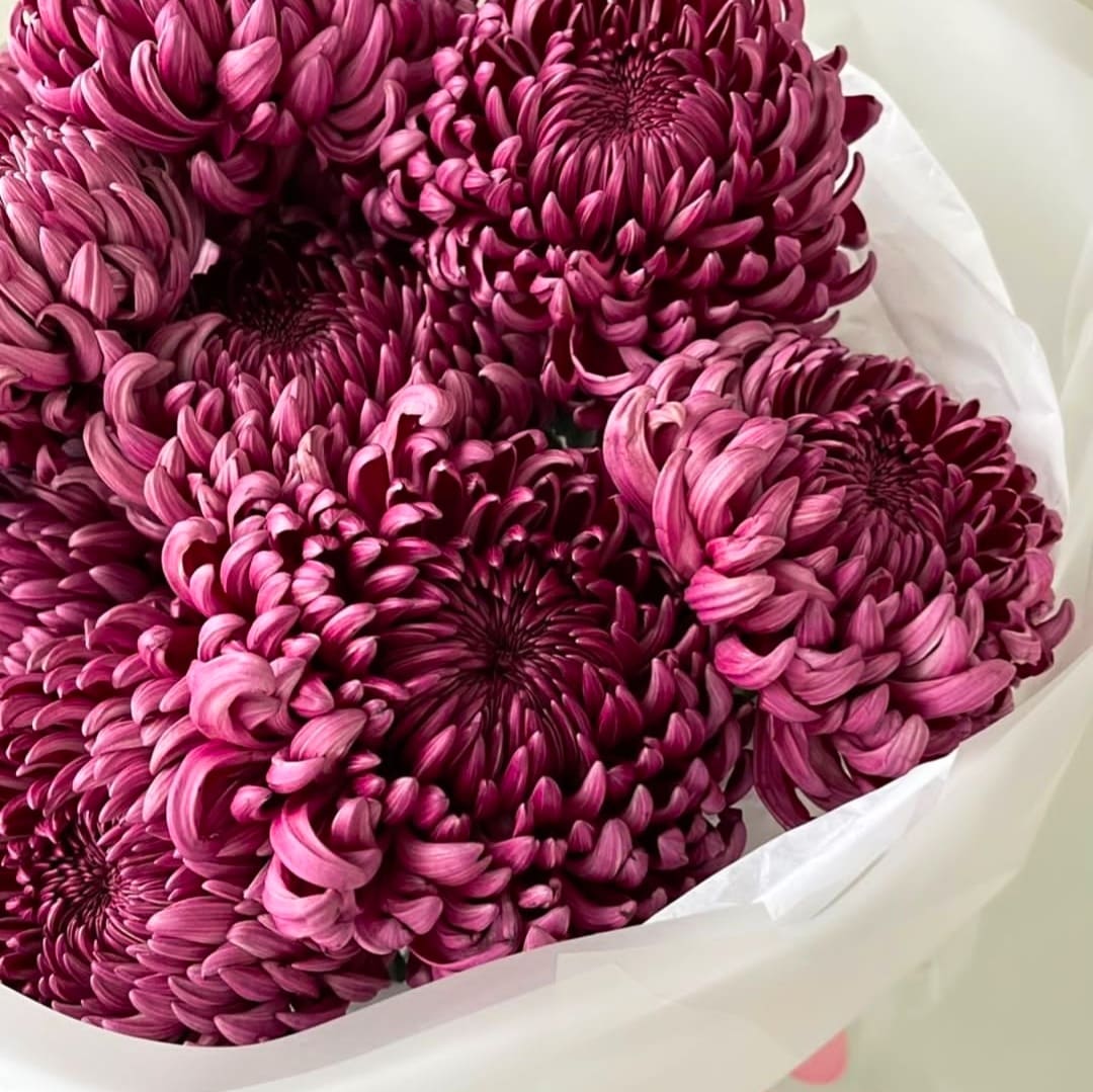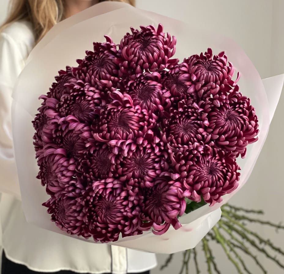 Разновидность хризантем сорта Бигуди глубокого винно-фиолетового цвета. Это один из наших любимых видов, он выглядит достойно и дорого. Упаковка стильная матовая пленка и ленты атласные.