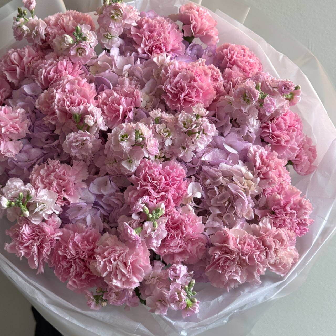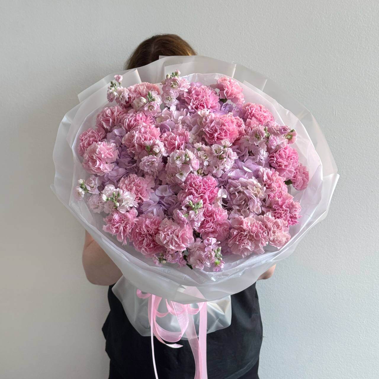 Трио-букет из гортензий, душистой кустовой маттиолы и гвоздик. Упаковка стильная матовая пленка, бумага тишью и ленты атласные.