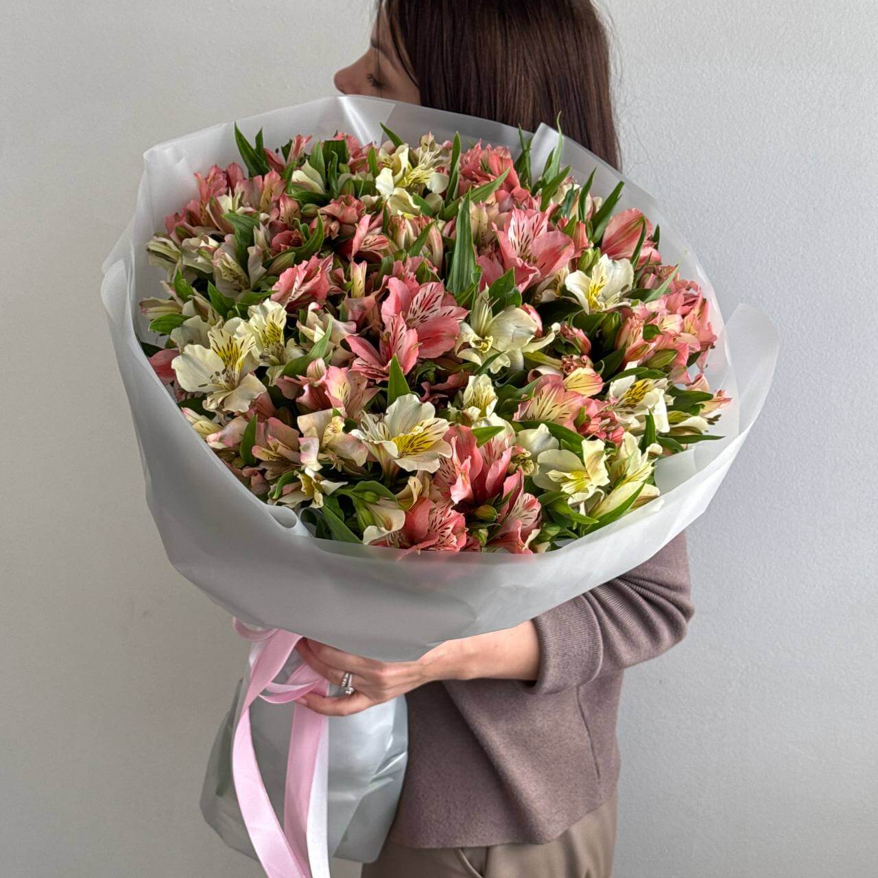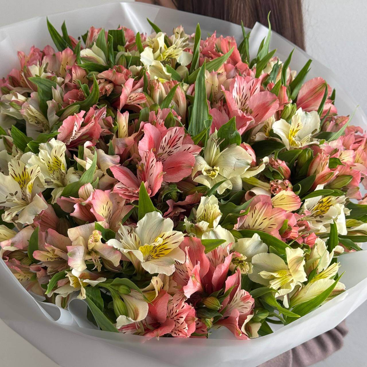Моно-букет из стойкой альстромерии. Упаковка стильная матовая пленка и ленты атласные. В наличии большая цветовая гамма, пришлем фото на выбор.