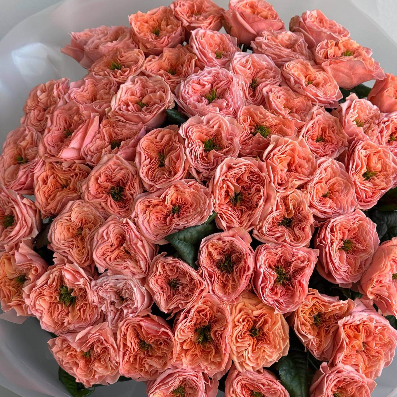 Пионовидные розы питер парк, словно апельсины, с очень красивым раскрытием. Упаковка матовая пленка и ленты атласные.