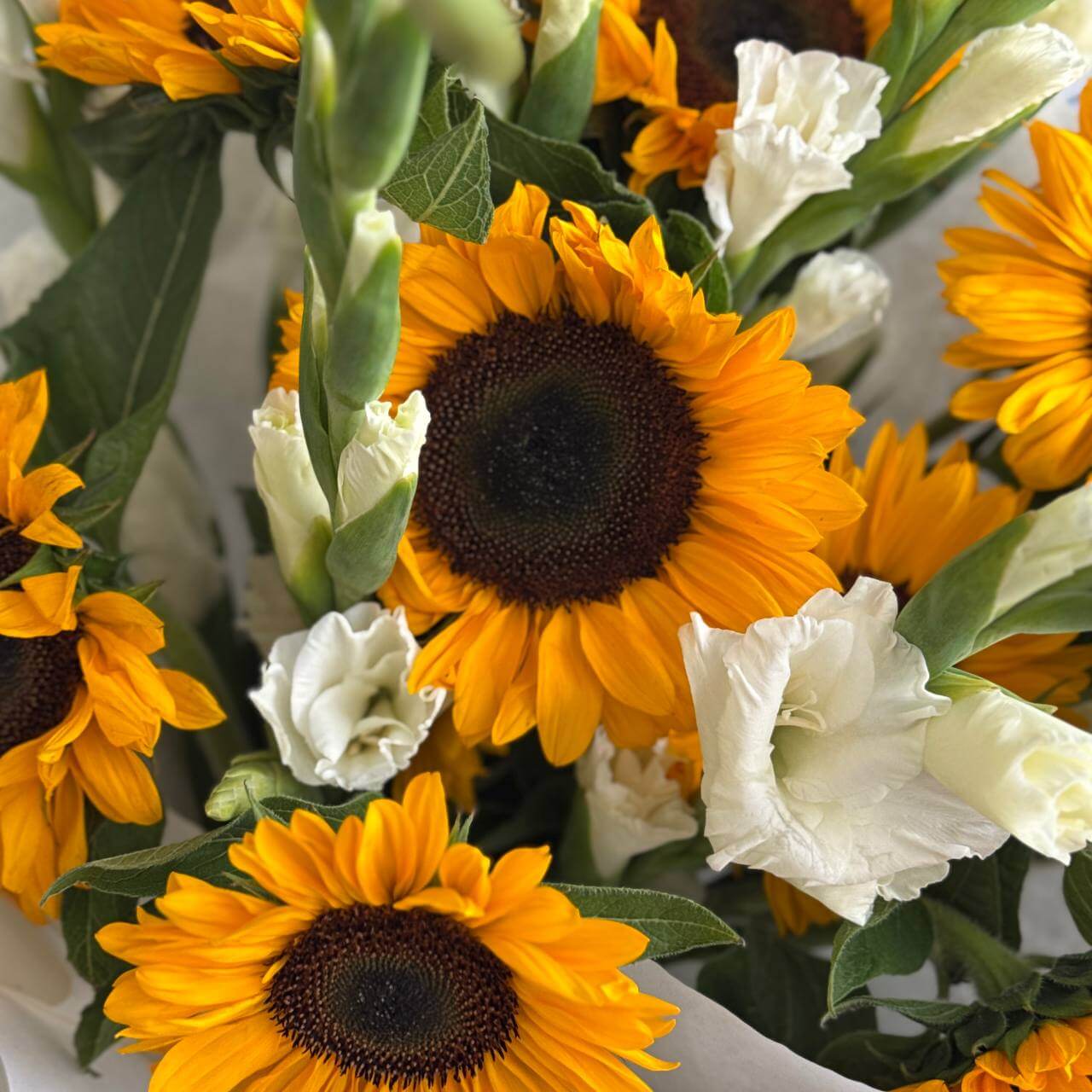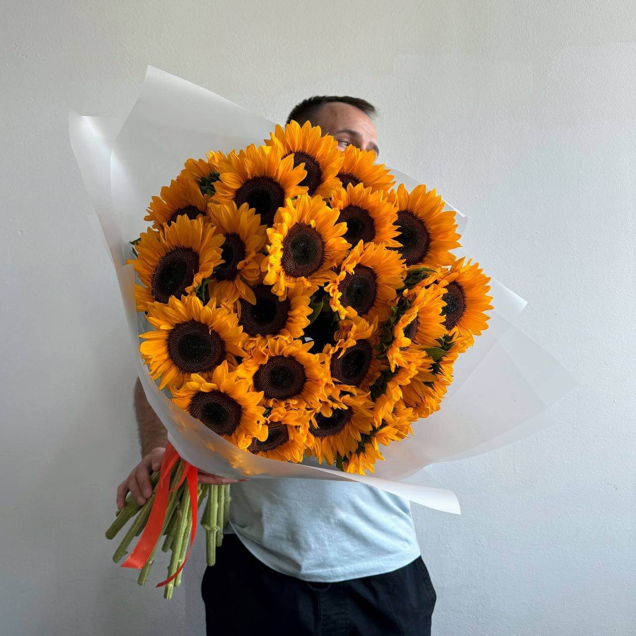 Самый популярный летний букет из подсолнухов и полевых ромашек. Упаковка дизайнерская пленка и ленты атласные.