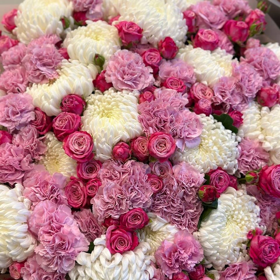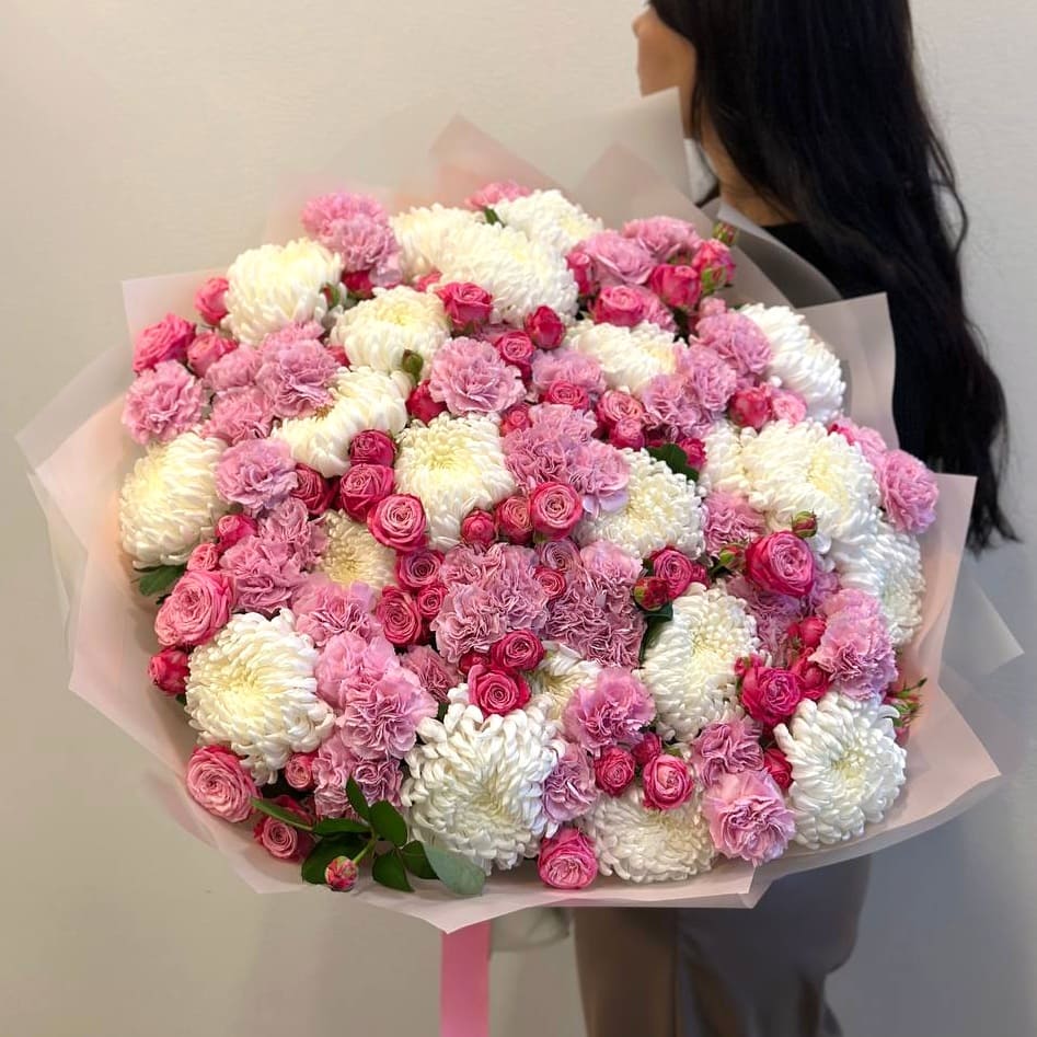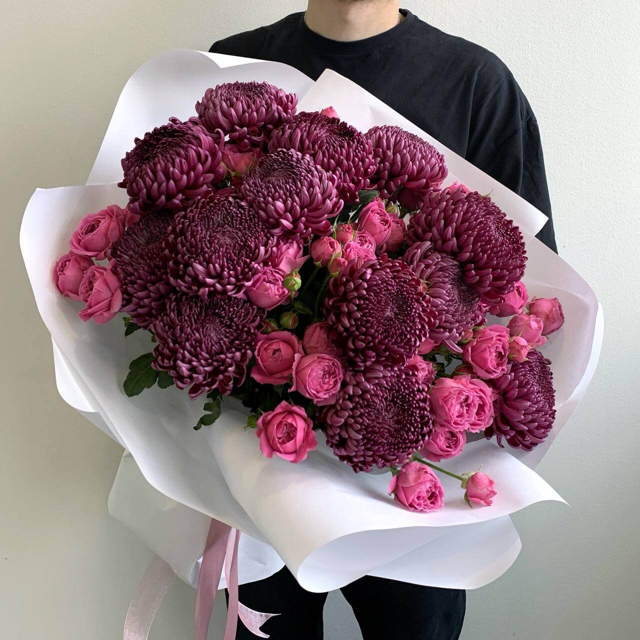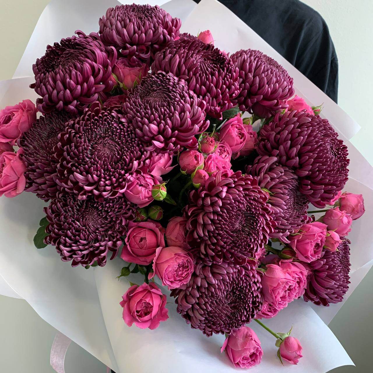 Дуо-букет из сезонных хризантем и кустовых пионовидных роз. Упаковка дизайнерская пленка и ленты атласные.