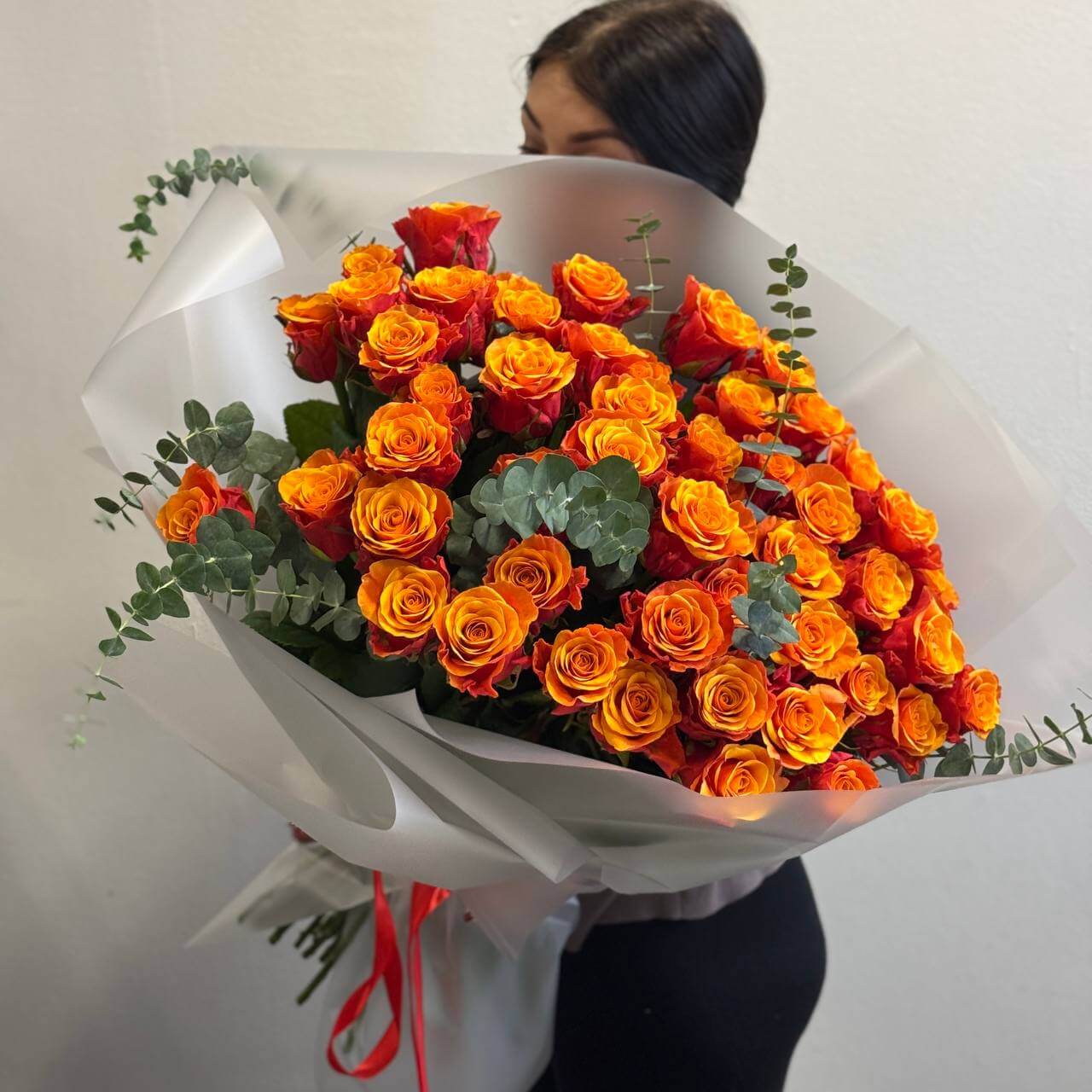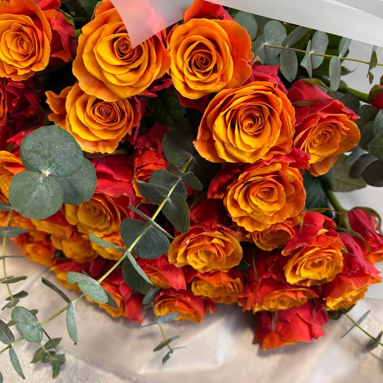 Один из самых популярных сортов роз в последнее время, роза Испания. Красивый желто-алый окрас и крепкий стебель. Этот сорт роз отличается своей стойкостью. Букет собирается с ветками эвкалипта. Упаковка матовая пленка и ленты атласные.