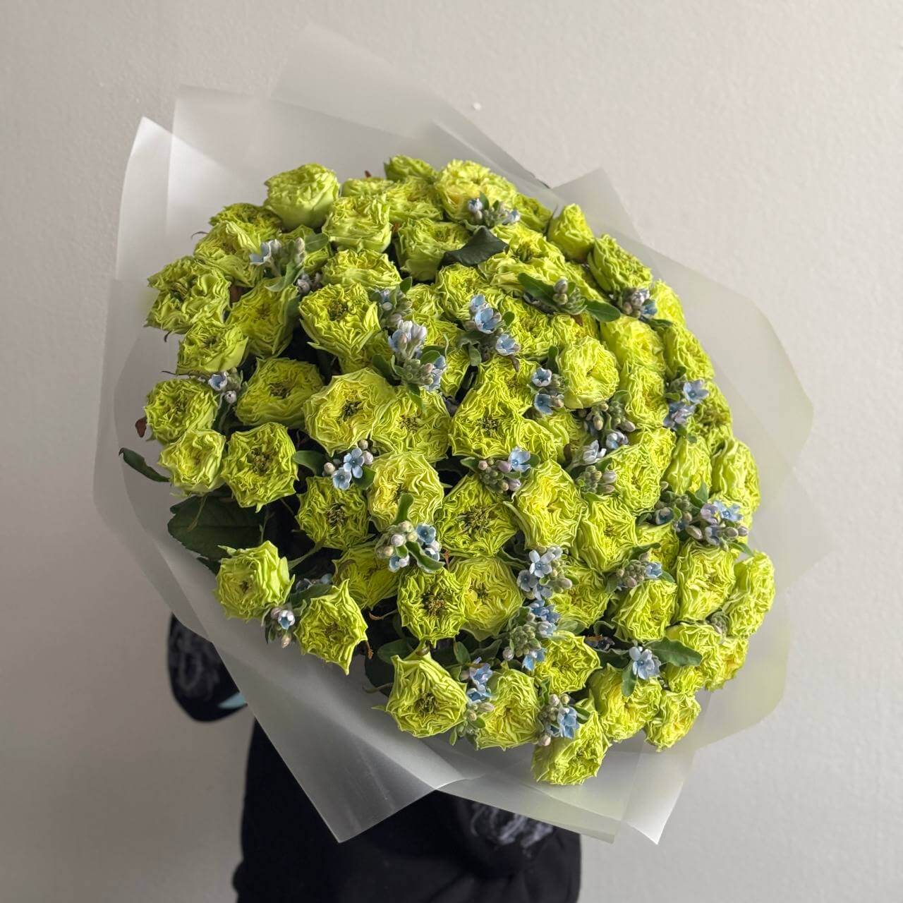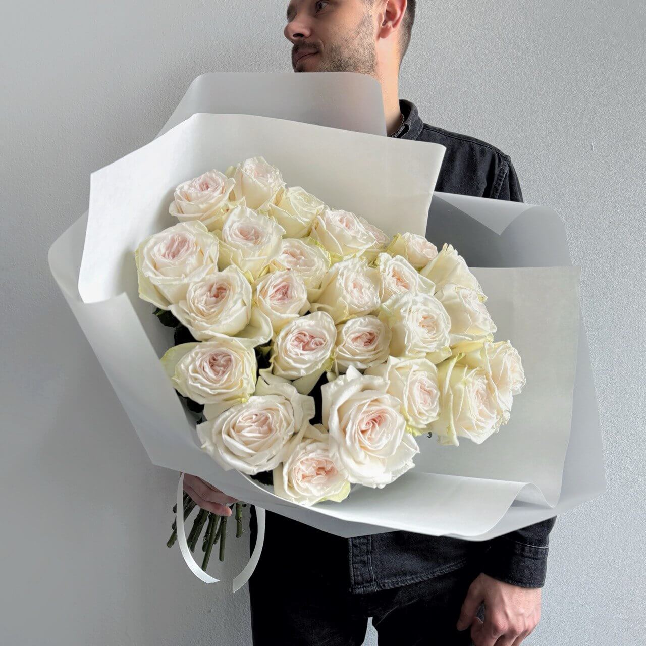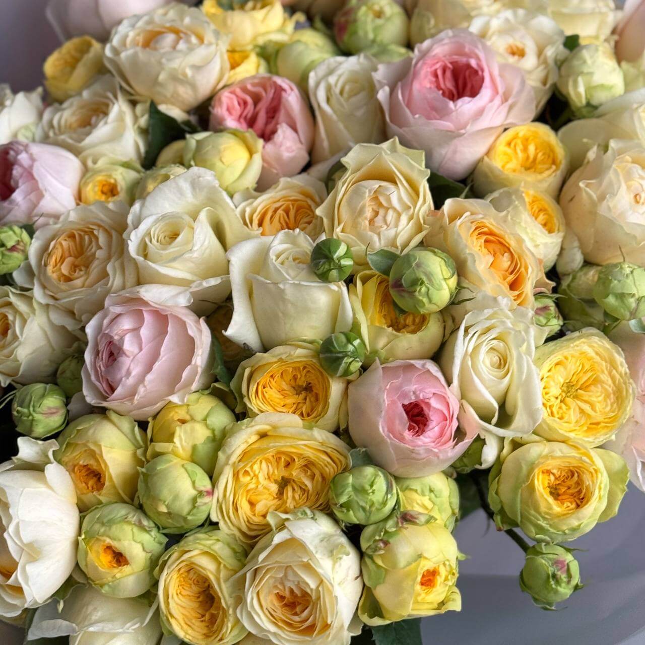 Микс из кустовых пионовидных роз Мадам Бомбастик и Мисти Баблз. Обладают легким сладким ароматом. Упаковка дизайнерская матовая пленка и ленты атласные.