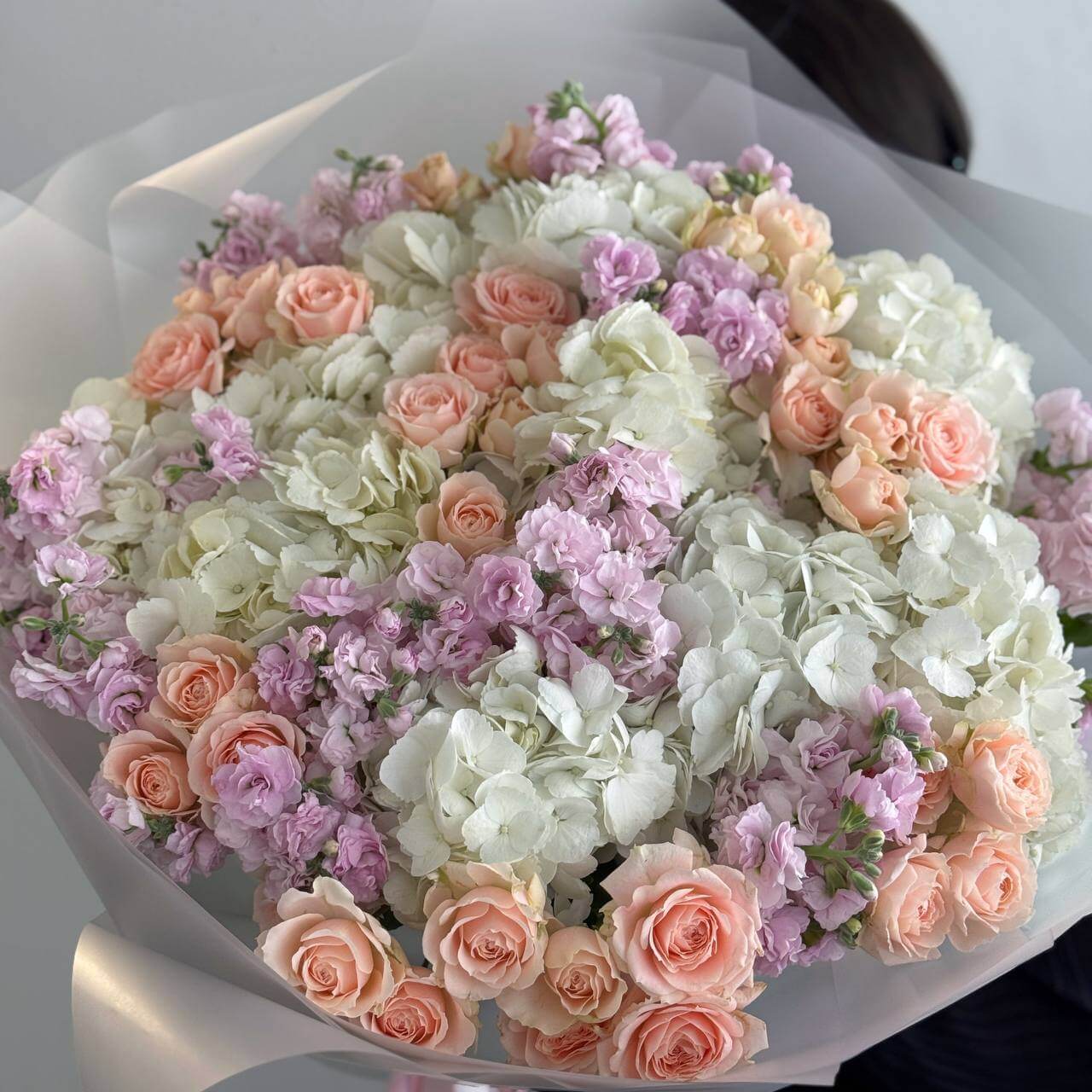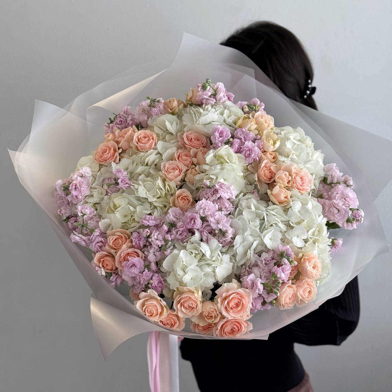 Сборный мега-супер-нежный и ароматный букет из гортензий, пионовидных кустовых роз бомбастик, ароматных пионовидных роз охара и душистой кустовой маттиолы. Упаковка дизайнерская пленка и ленты атласные.