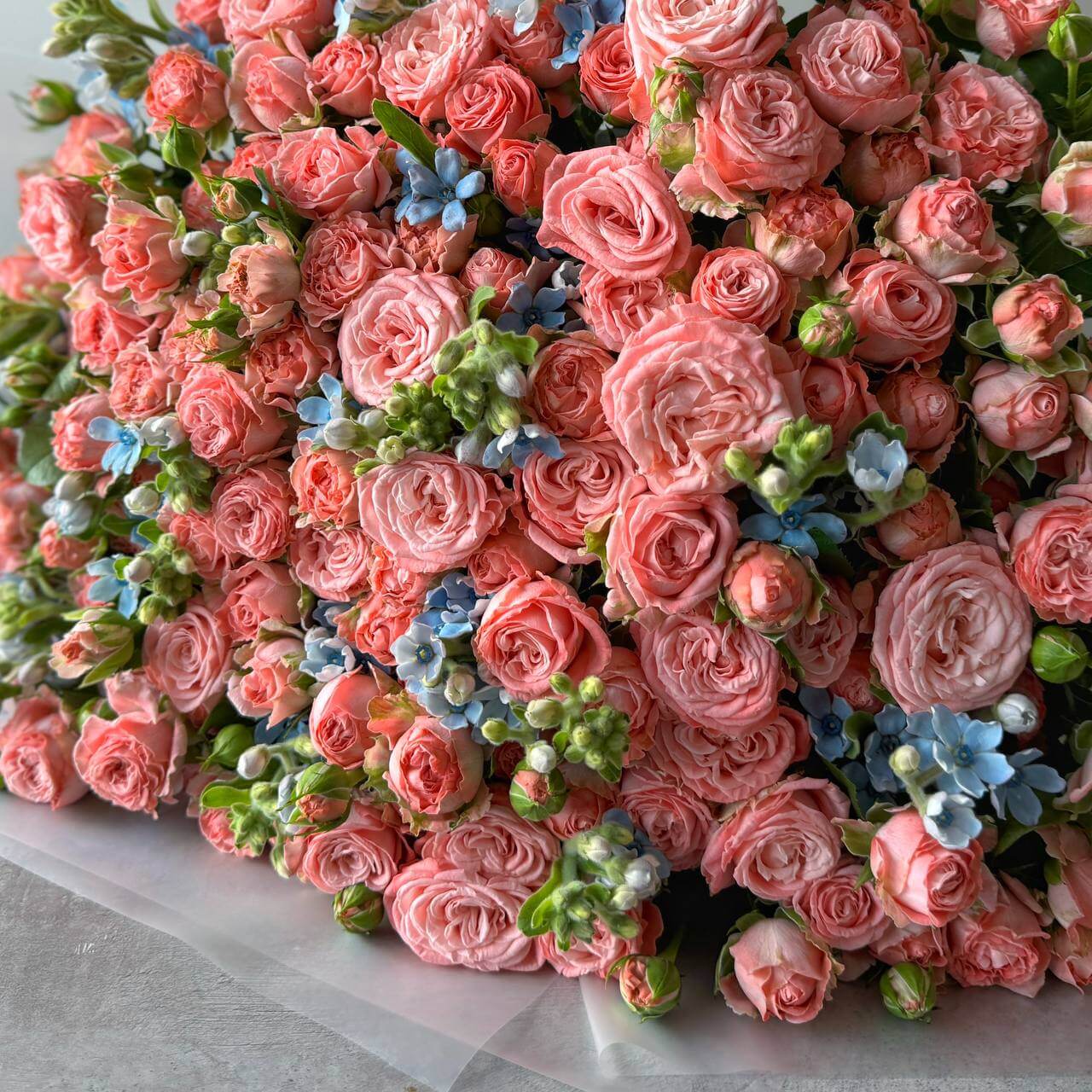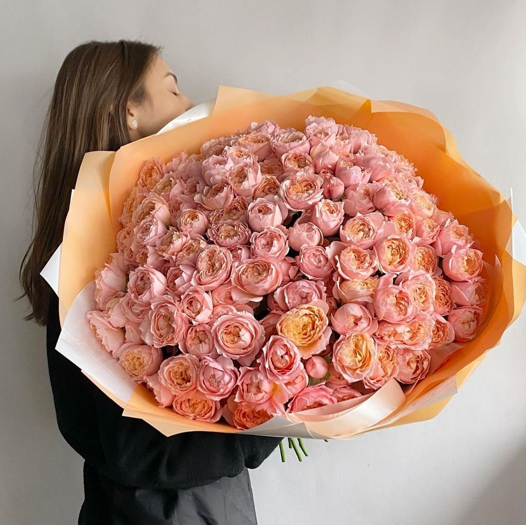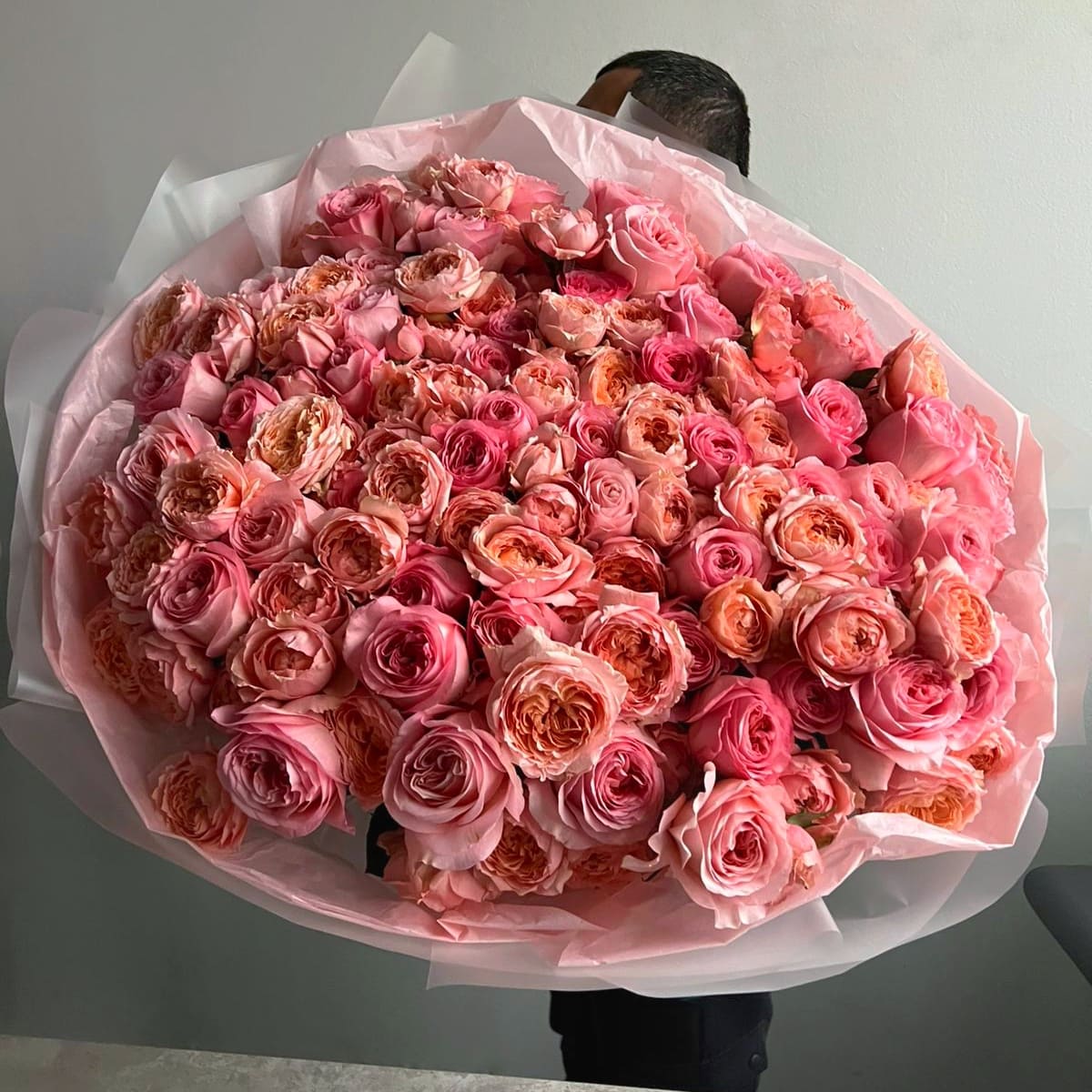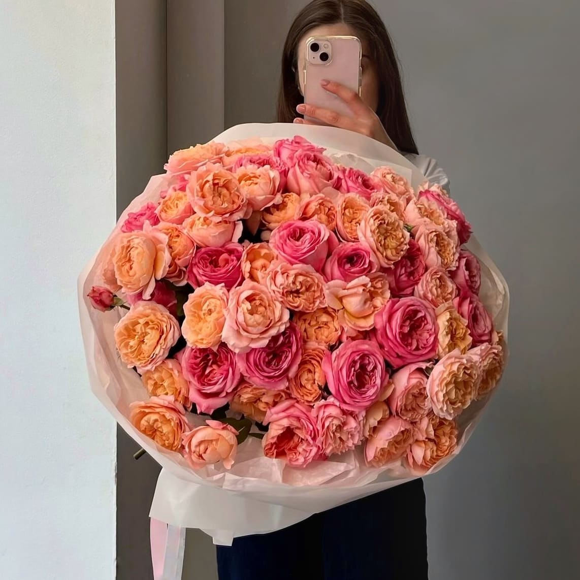 Идеальный микс из кустовых пионовидных роз джульетта и пионовидных роз пинк экспрешен. Упаковка матовая пленка и ленты атласные.