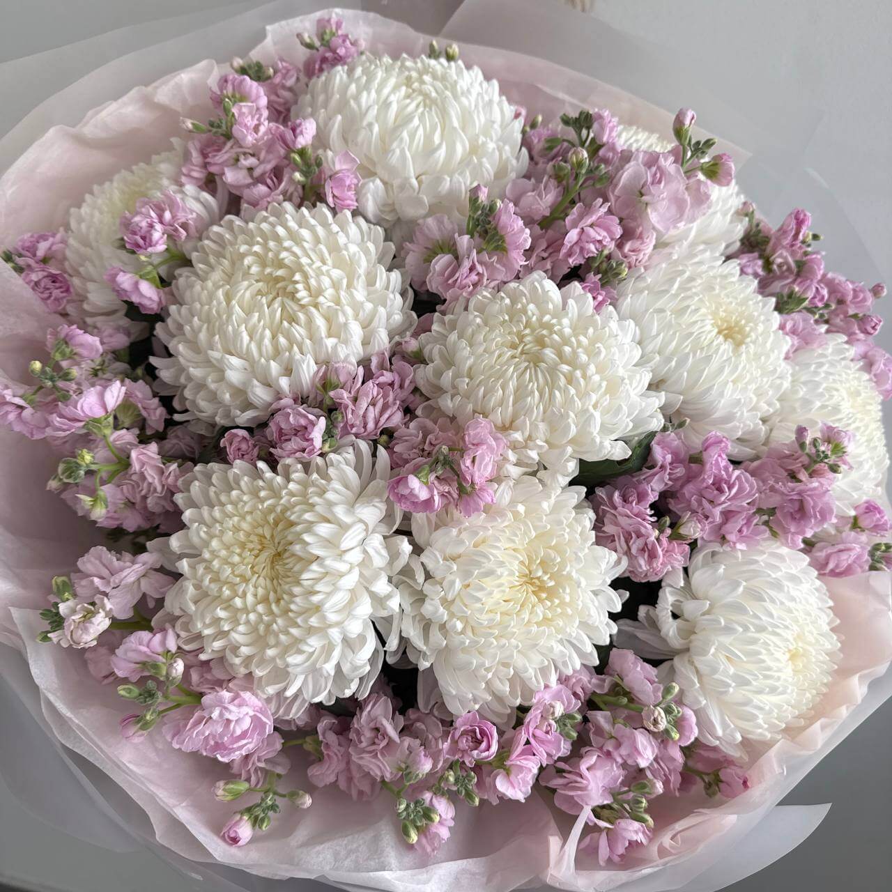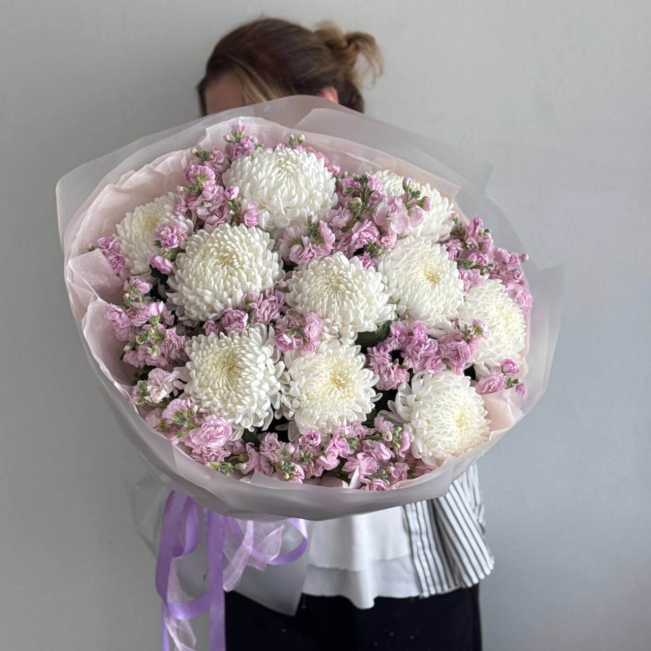 Дуо-букет из душистой кустовой маттиолы и сезонных хризантем. Упаковка дизайнерская пленка и ленты атласные.
