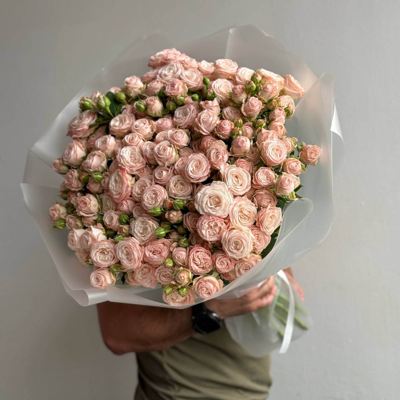 Микс из кустовых пионовидных роз леди бомбастик и мисти баблз. Упаковка дизайнерская пленка и ленты атласные.