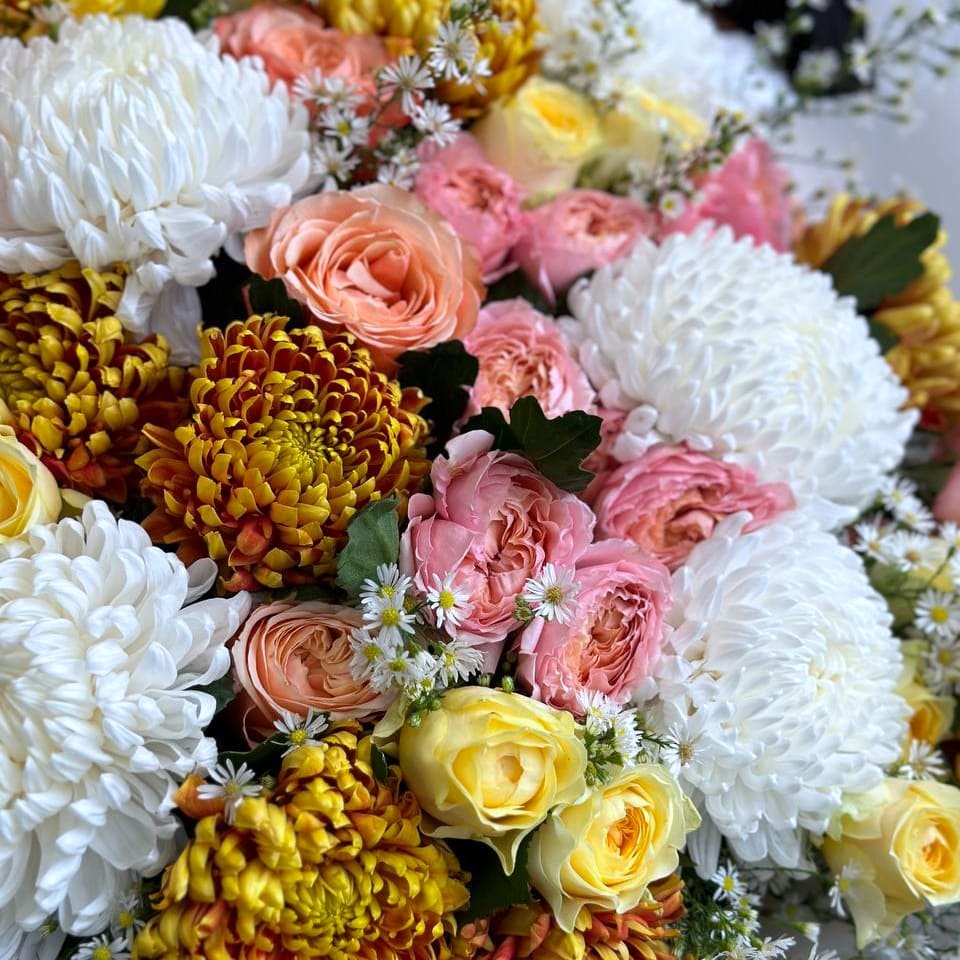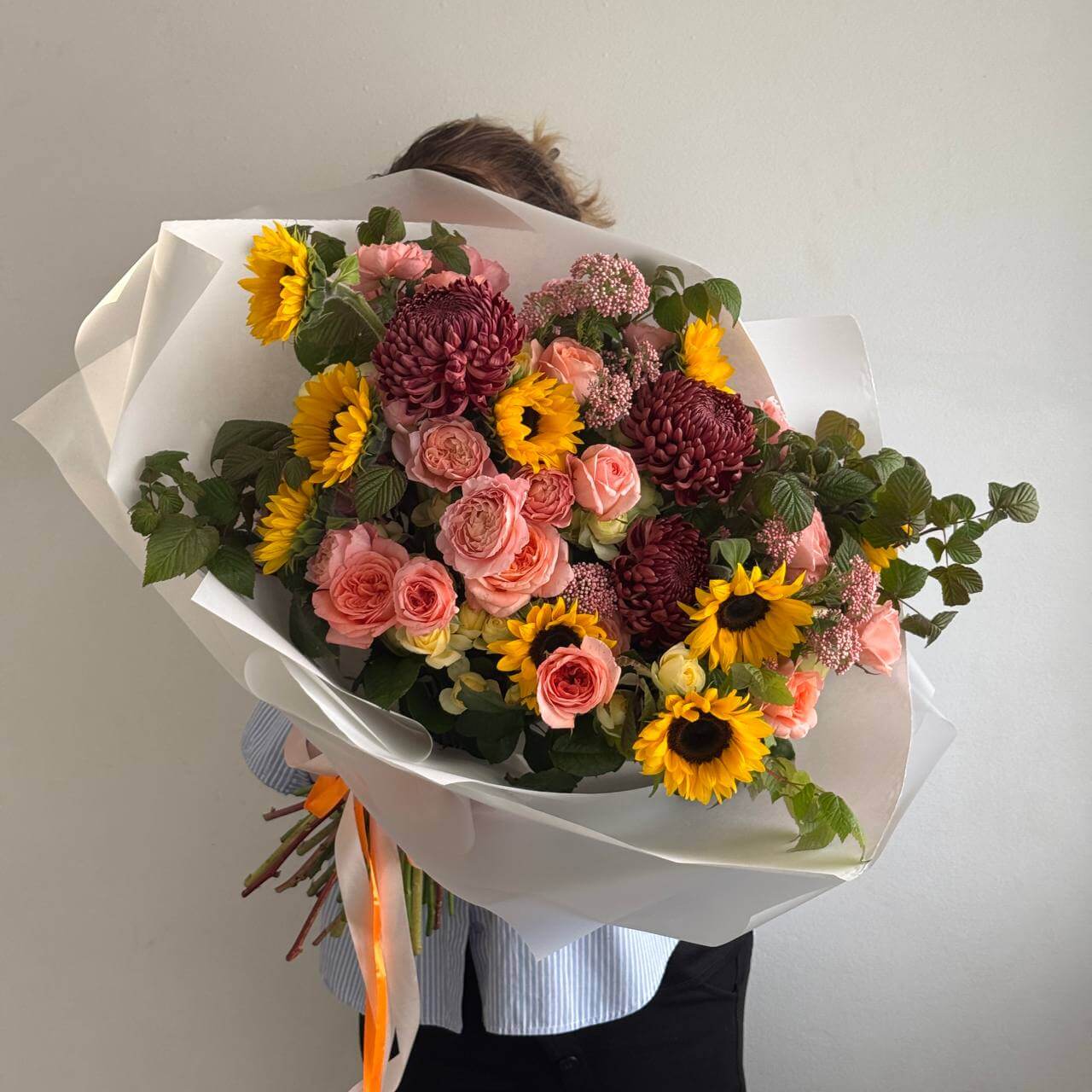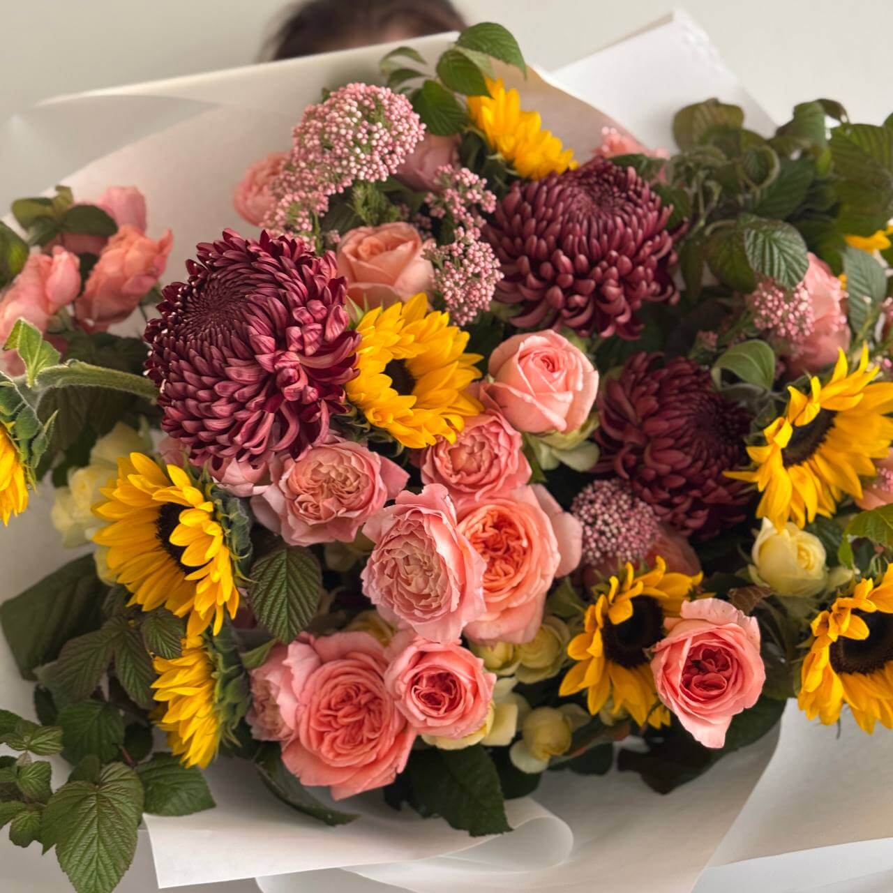 Букет из сезонных цветов в красках осени. В составе пионовидные кустовые розы двух сортов, хризантемы бигуди, сезонная зелень, пионовидные розы лондон ай, подсолнухи. Упаковка дизайнерская пленка и ленты атласные.