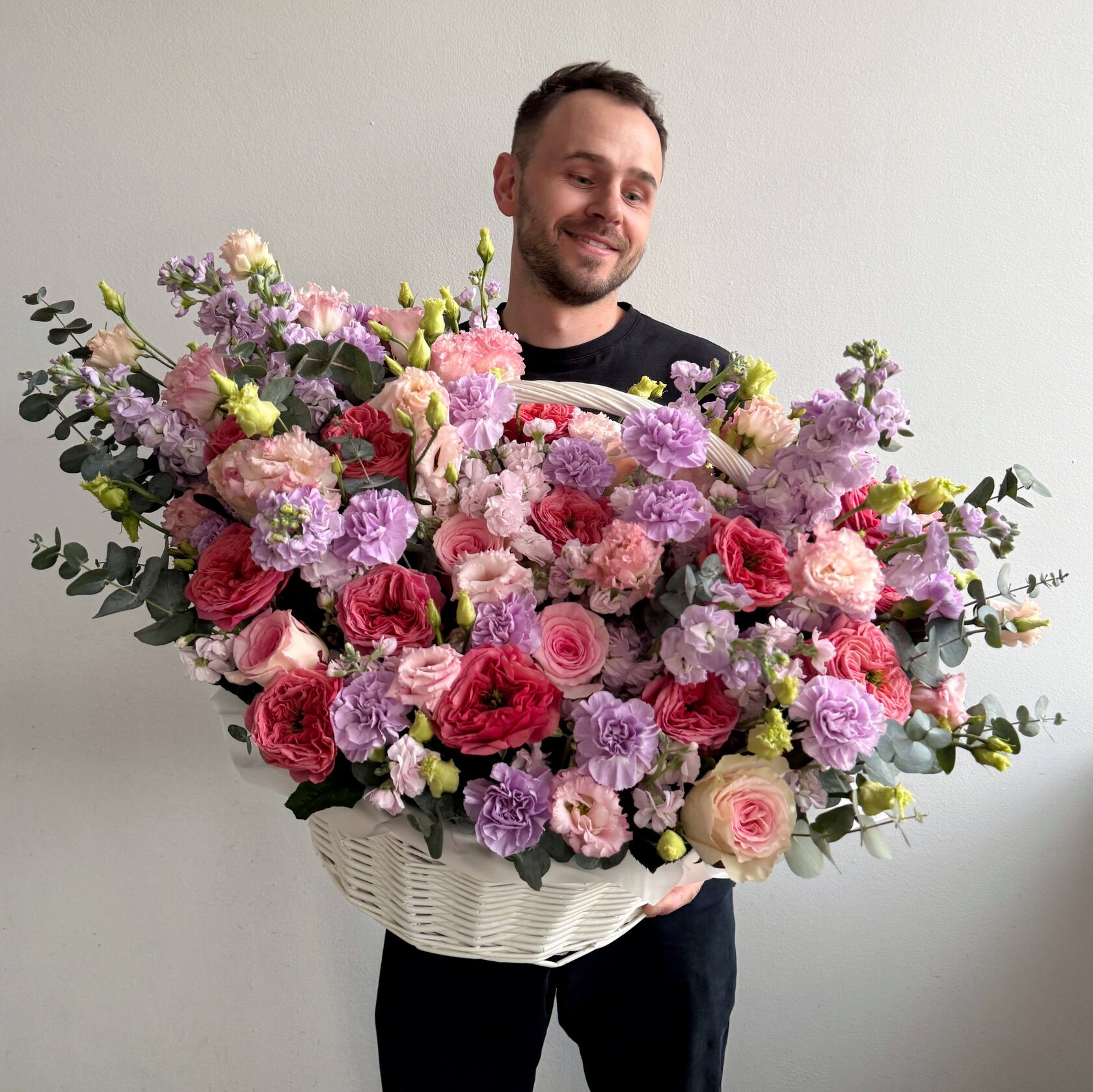 Авторская композиция в корзине в розово-сиреневых тонах. В составе композиции пионовидные розы, ажурная эустома, диантус, душистая маттиола, розы классические и эвкалипт.