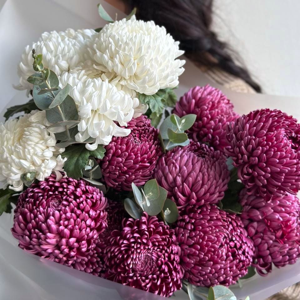 Букет из сезонных хризантем бигуди с ветками эвкалипта. Упаковка дизайнерская пленка и ленты атласные.