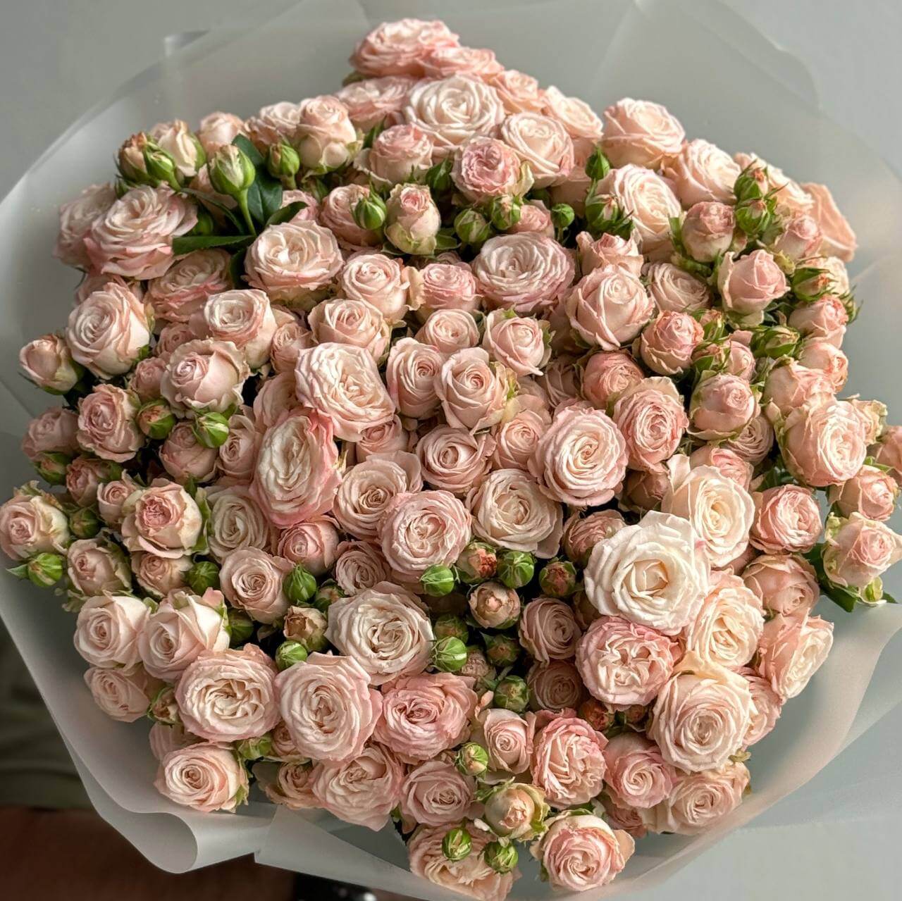 Микс букет из нескольких сортов пионовидных роз в нежно-пудровых тонах. Упаковка дизайнерская пленка и ленты атласные.