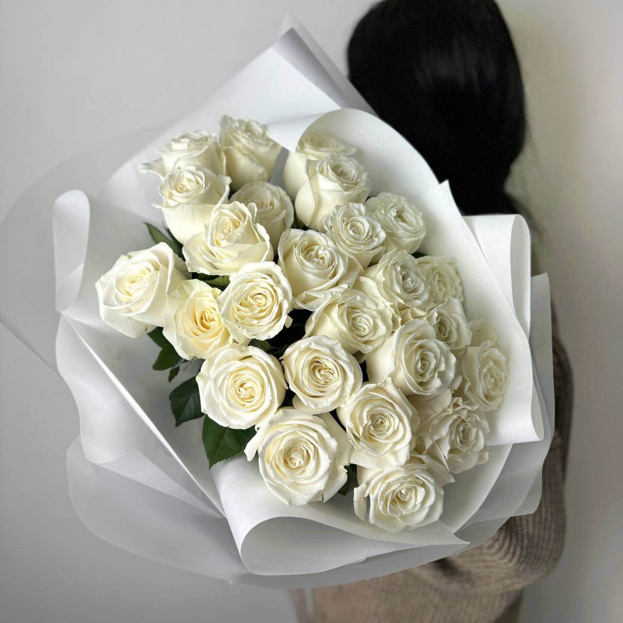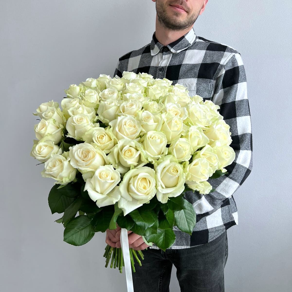 Белоснежные Эквадорские розы сорта Плая Бланка(Playa Blanca). Высота стебля от 70см. Упаковка дизайнерская пленка и ленты атласные.