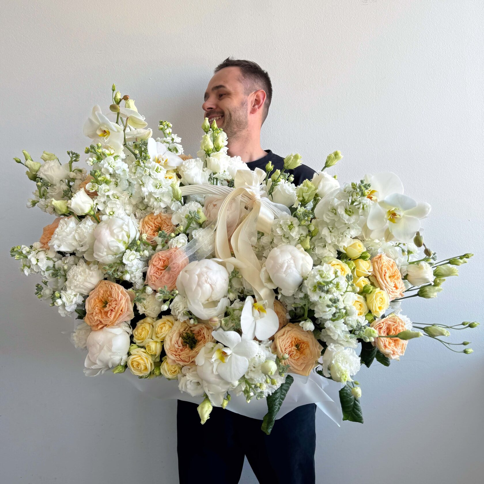 Авторская композиция в корзине в бело-персиковых тонах. В составе композиции пионовидные розы, ажурная эустома, душистая маттиола, розы пионовидные кустовые, пионы и орхидеи.
