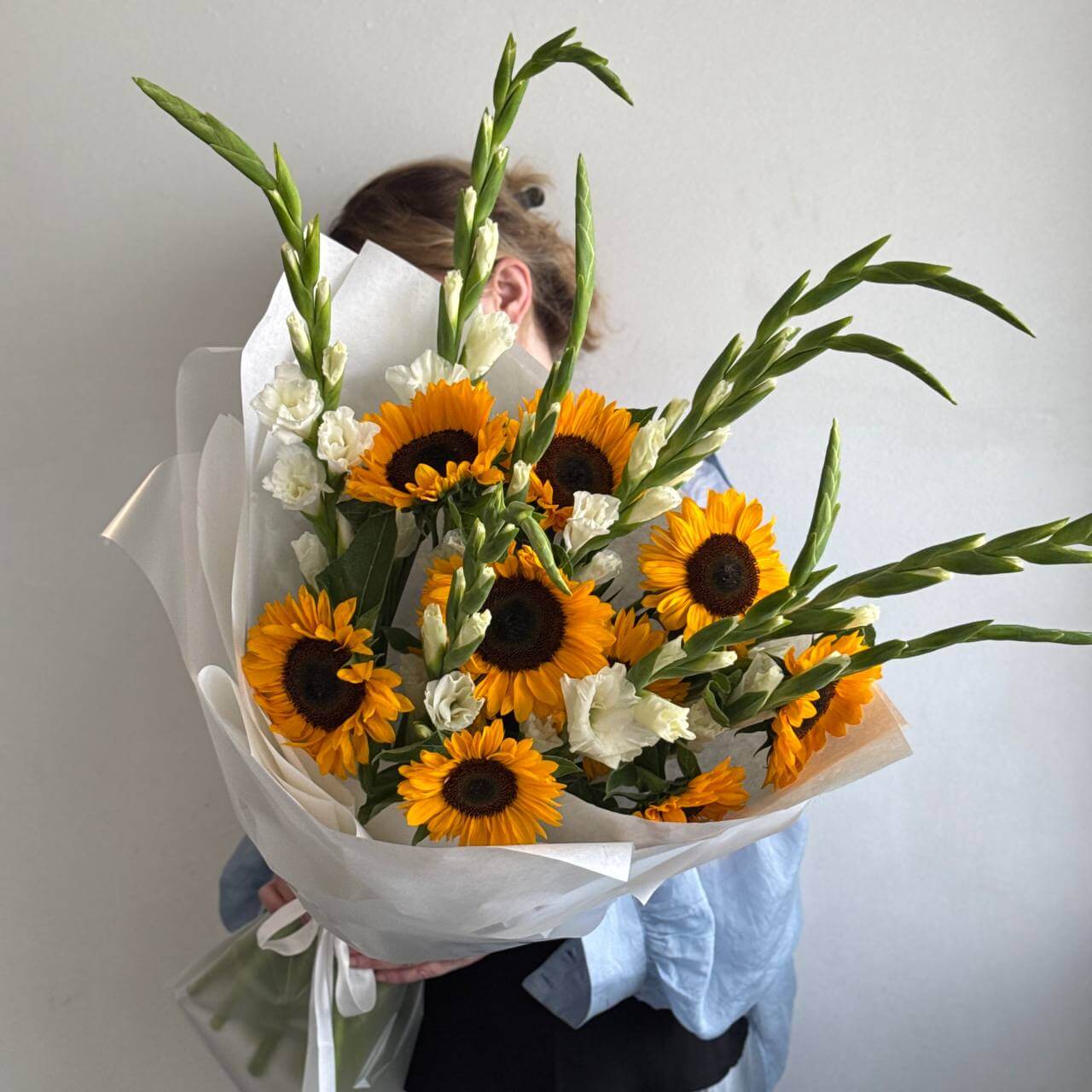 Дуо-букет из сезонных подсолнухов и гладиолусов. Упаковка дизайнерская пленка и ленты атласные.