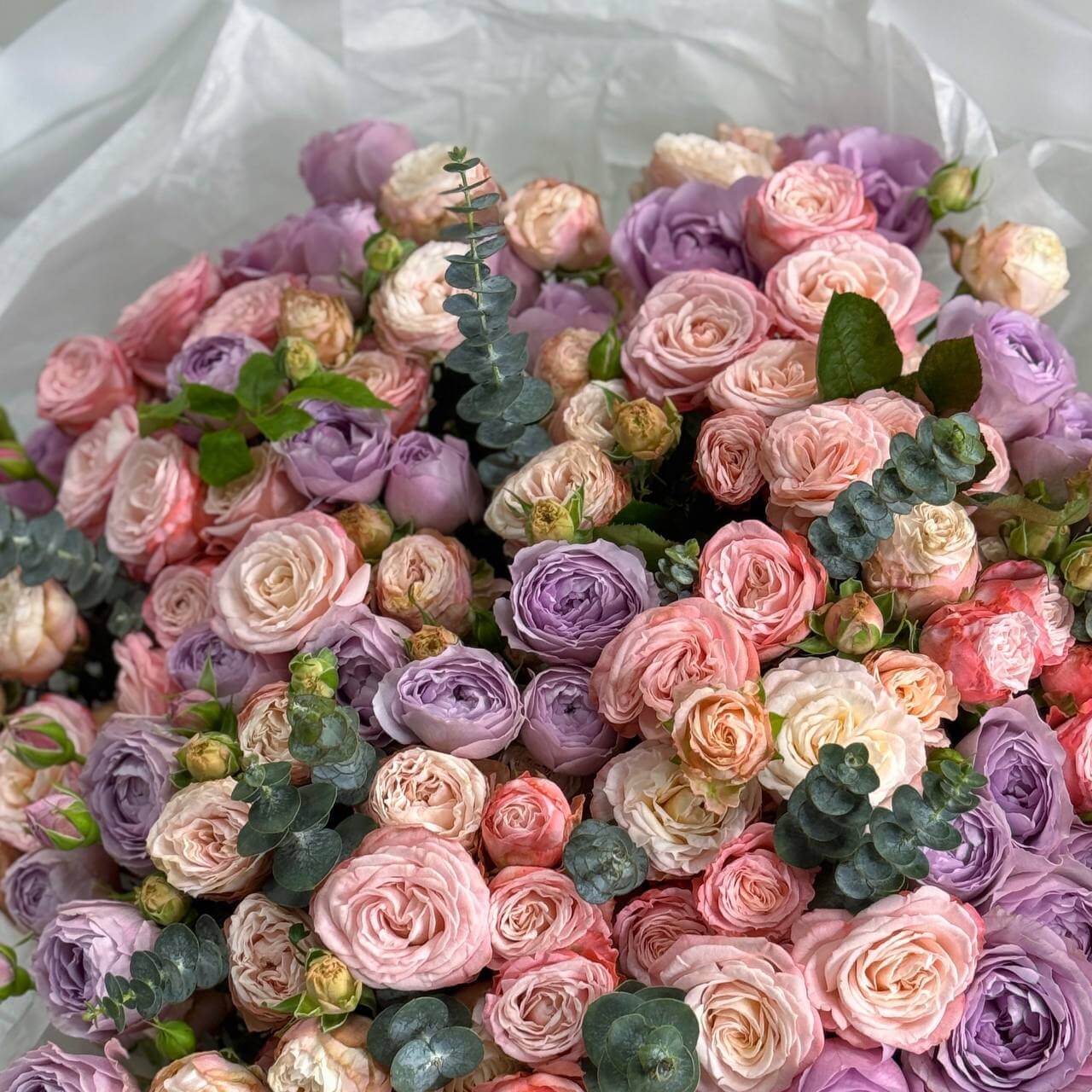 Букет из трех видов кустовых пионовидных роз с ветками эвкалипта. Упаковка бумага тишью и матовая пленка.