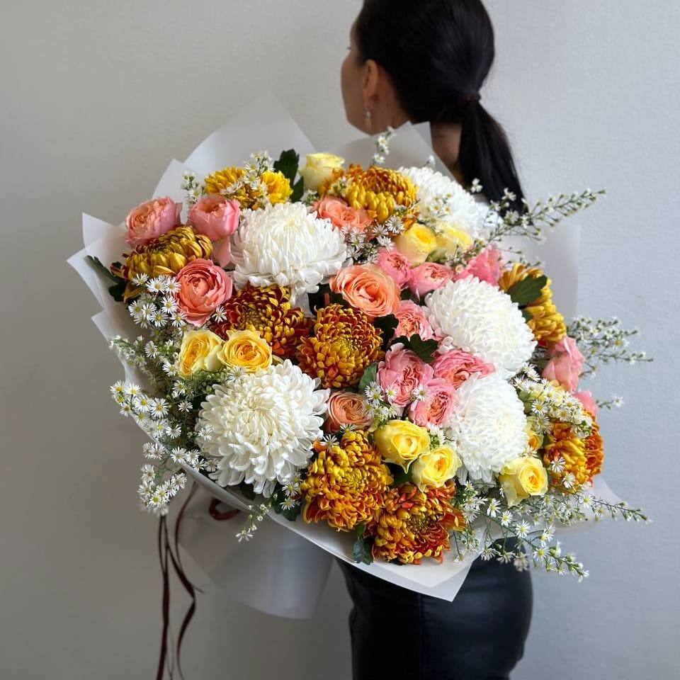 Сборный букет из сезонных хризантем, пионовидных рох и зелени. Упаковка дизайнерская пленка и ленты атласные.