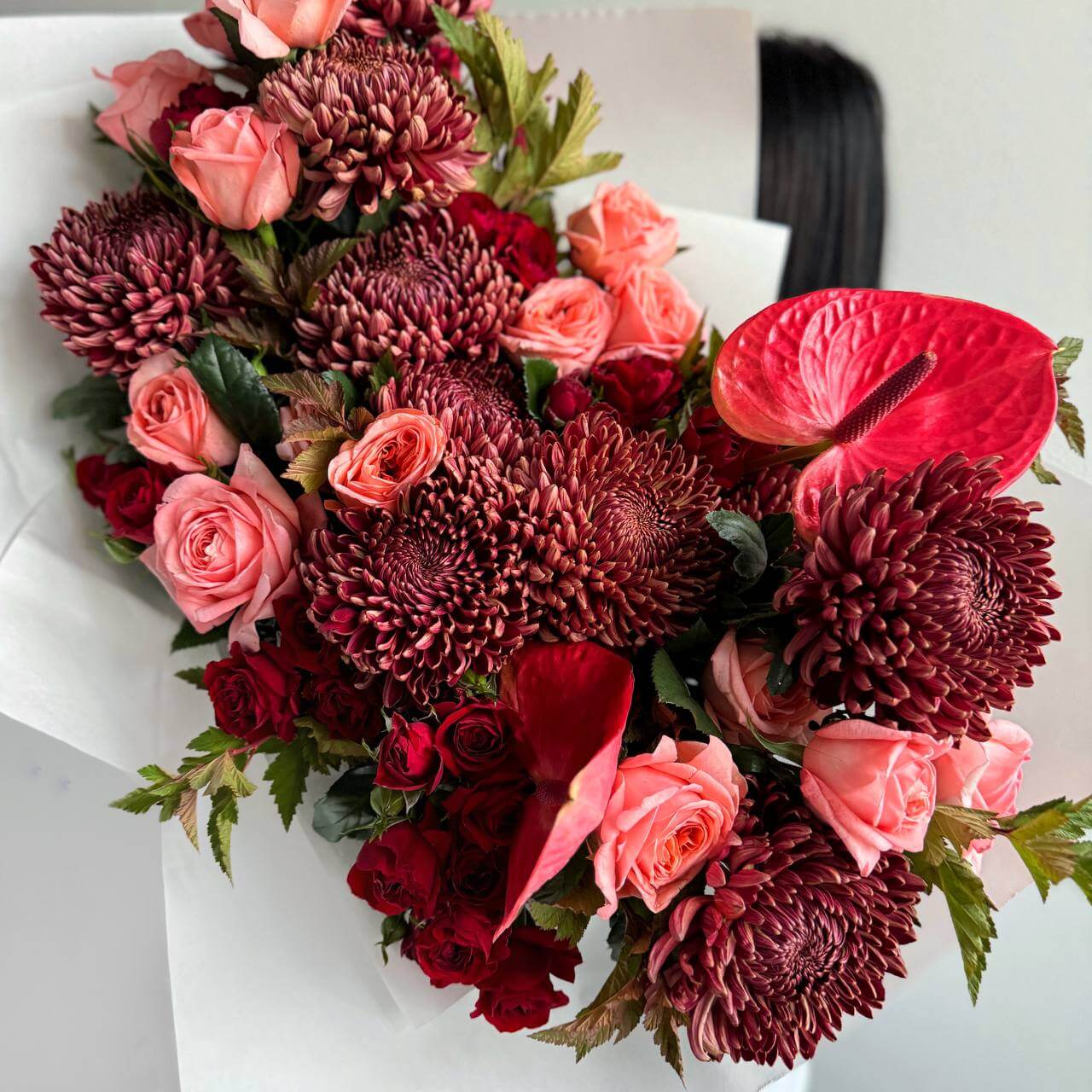 Авторский букет из сезонных хризантем бигуди, пионовидных роз лондон ай, антуриумов, кустовых пионовидных роз и зелени. Упаковка дизайнерская пленка и ленты атласные.